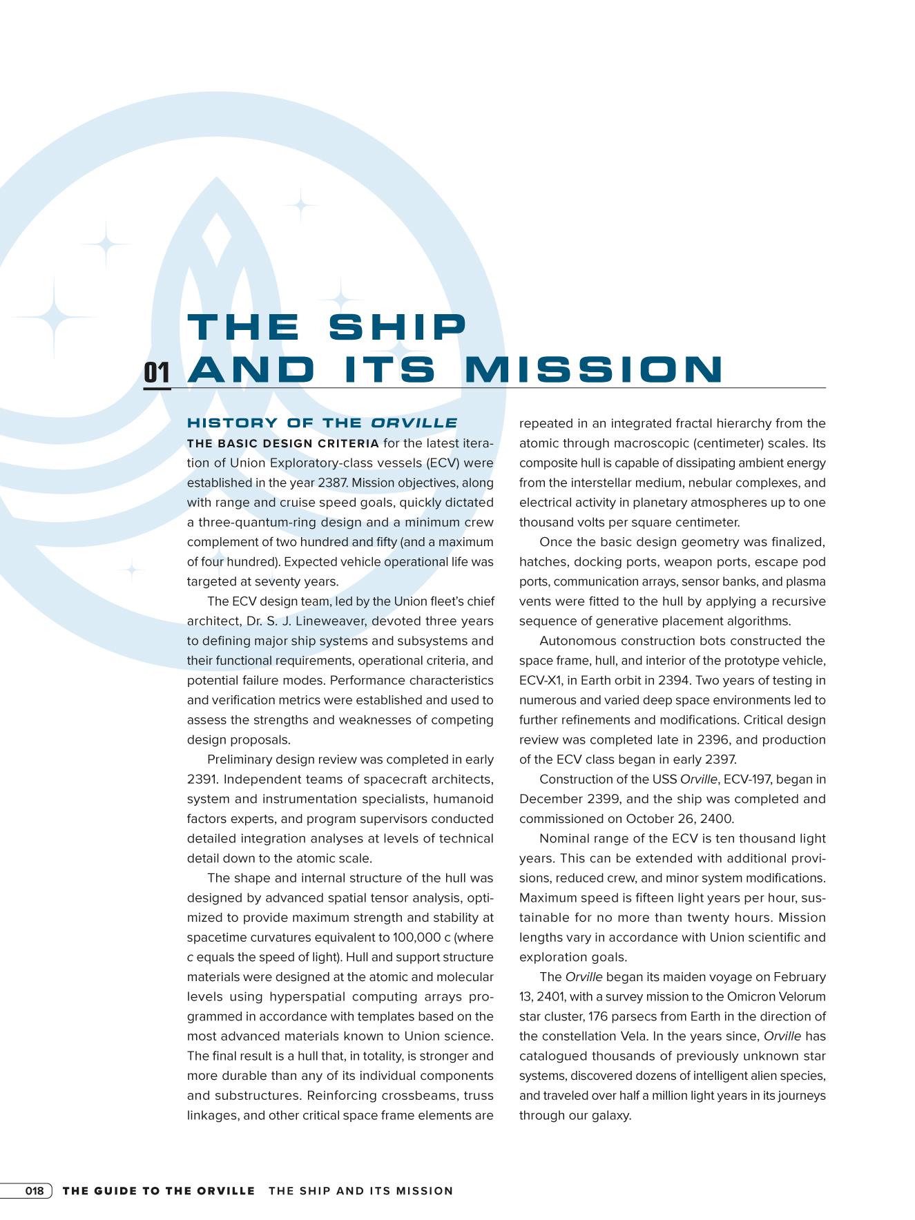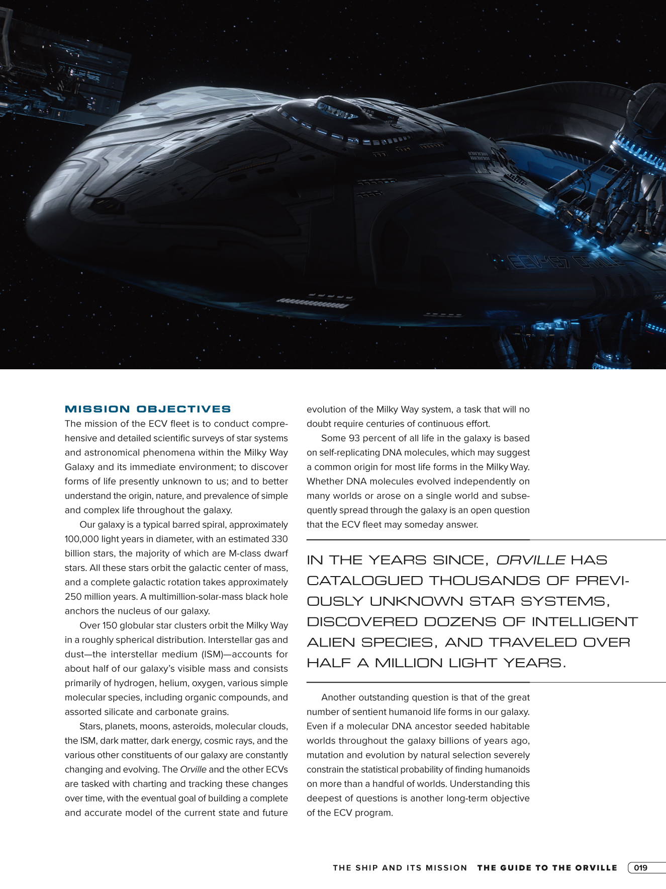 Explore exotic alien planets, adventure between innumerable stars, and get to know a diverse starship crew as they navigate their thrilling and mysterious universe. Captain Ed Mercer and his brave shipmates guide readers through the decks of the Orville, recounting their voyages through ship logs, and providing insightful commentary on the state of a changing galaxy.