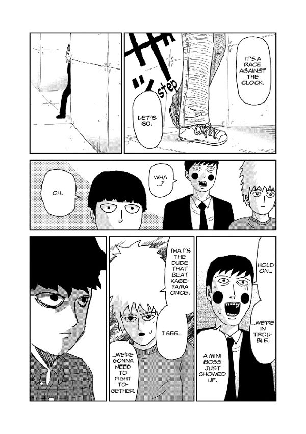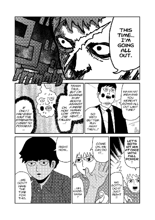 Mob's younger brother Ritsu has been abducted by the sinister superpowered cabal, Claw! In order to save him, Mob and Teru team up with Dimple to infiltrate the mysterious organization . . . in a psychic battle that will pit middle school kids up against adults with money, resources . . . and powers of their own!