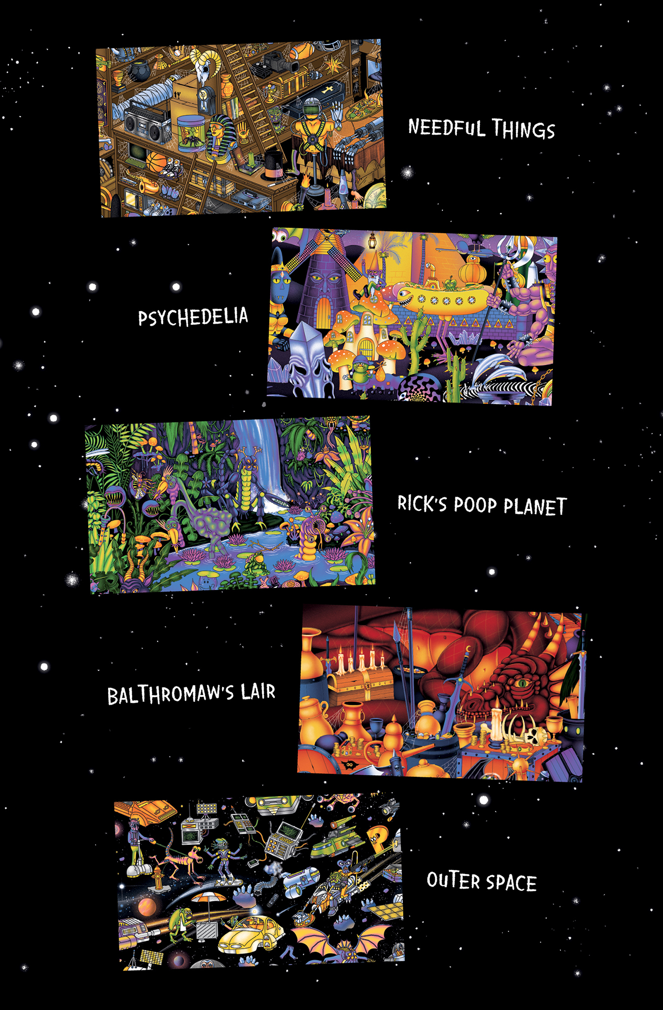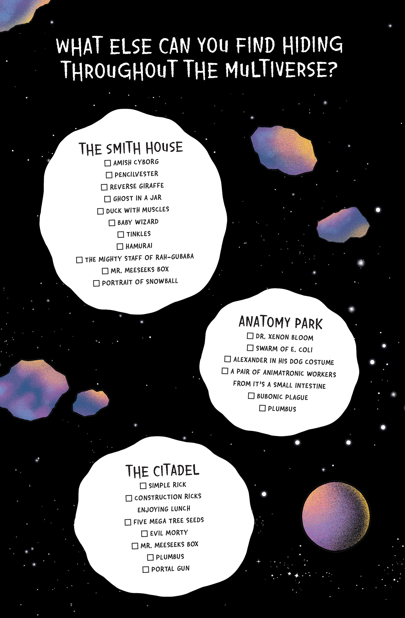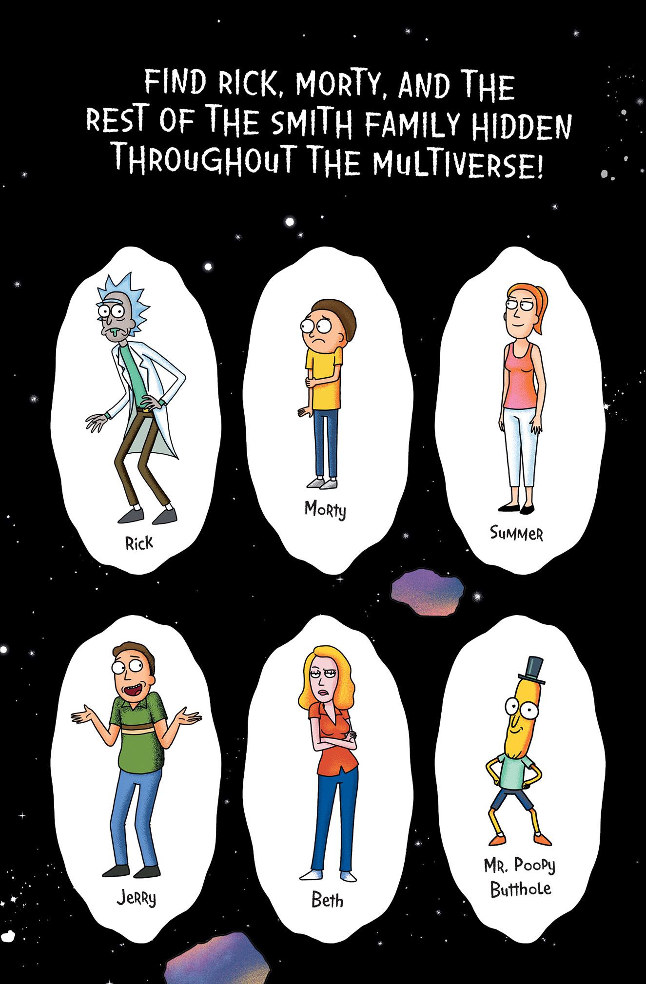 A superbly rendered puzzle book packed with colorful characters and picturesque locations from the Rick and Morty multiverse. Spend your every waking moment pouring over intergalactic variations of unreality looking for Rick, Morty, their friends, foes, acquaintances, and adversaries so you can avoid considering your own existence by confirming theirs!