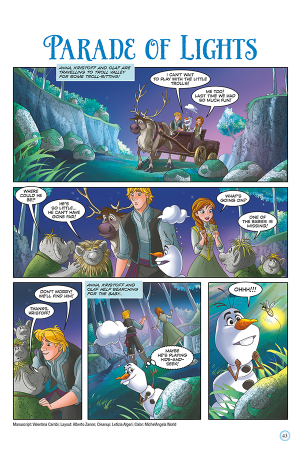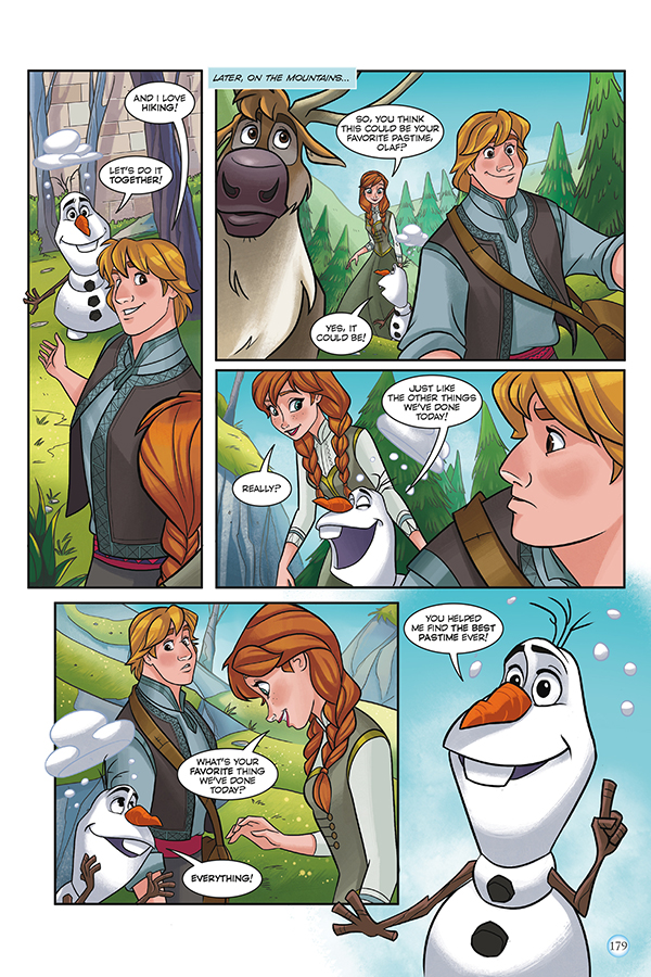 A collection of short comic stories expanding on the world of Disney Frozen! Collecting over 200 pages of Disney Frozen comics, this graphic novel anthology opens the gates of Arendelle and gives you a closer look at the everyday lives of Elsa, Anna, Kristoff, Sven, and Olaf!