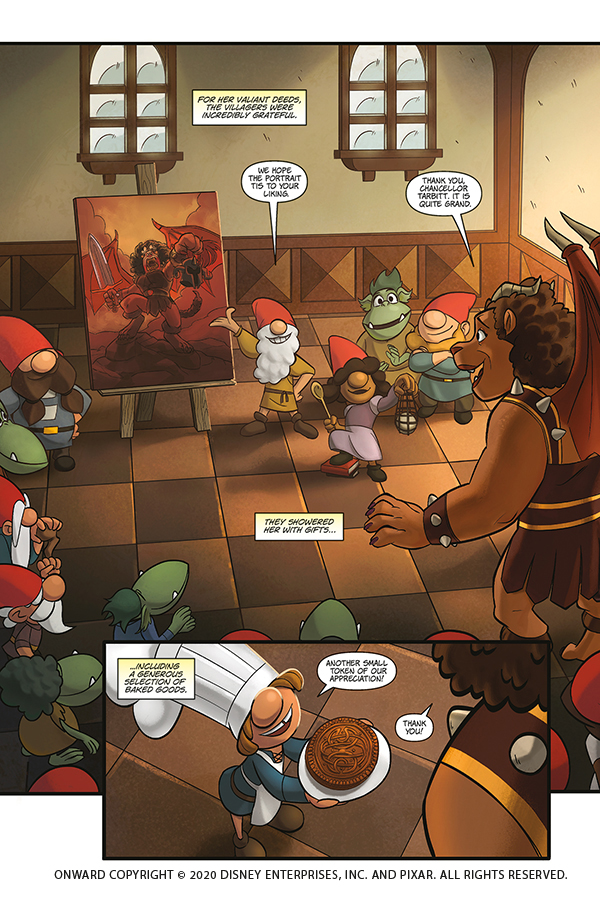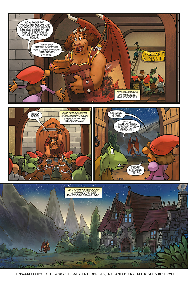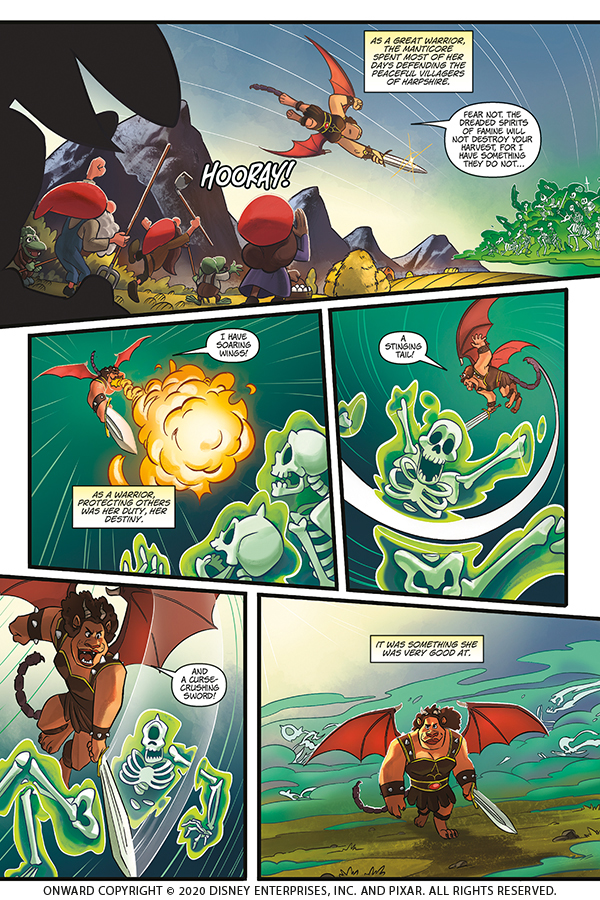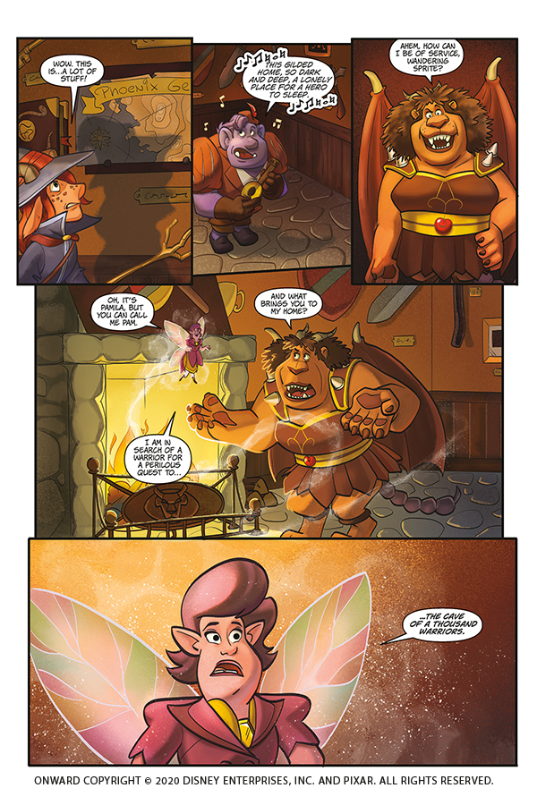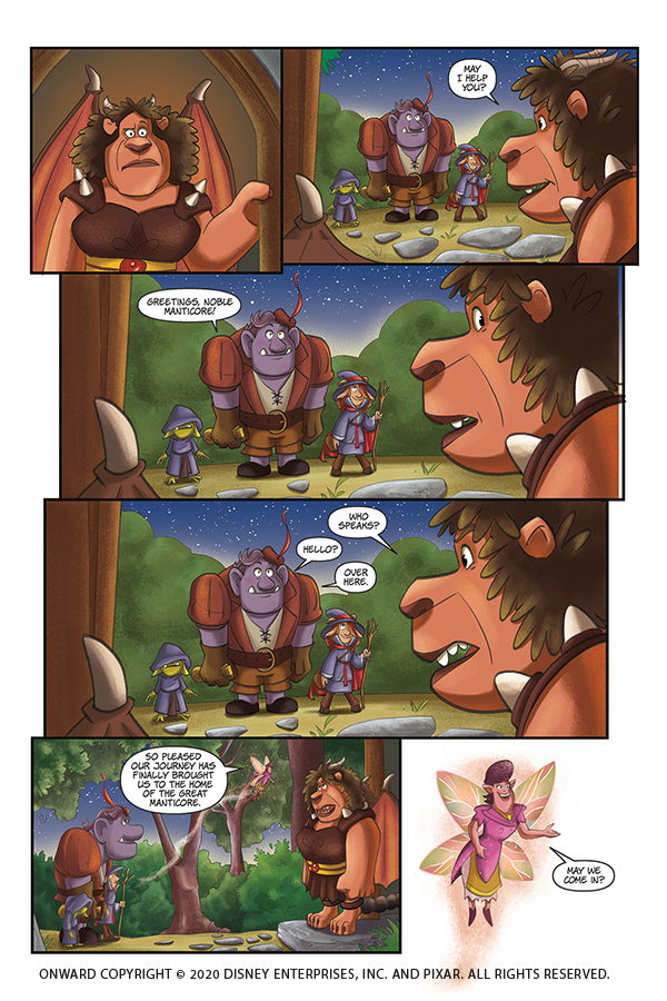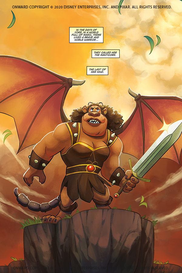 From acclaimed writer Mariko Tamaki (X-23, This One Summer) comes Disney/PIXAR Onward: Manticore, an original graphic novel tying into the upcoming film! Follow the Manticore on her quest to the Cave of a Thousand Heroes, from whence no other warrior has EVER returned. Along the way, the Manticore will make many strange allies, namely a very out-there Sprite named Pamila (Pam for short).