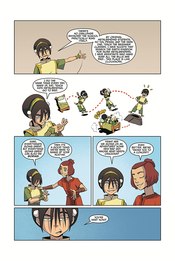 Things are looking bright at the Beifong Metalbending Academy! But after all the adventures Toph's had with Aang, Sokka, Zuko, and Katara, the whole thing feels a bit dull. Luckily, Sokka and Suki come to visit and reintroduce some familiar faces from their wandering days. And while out and about to celebrate, Toph discovers something that just might put the sparkle back in her eye. . .