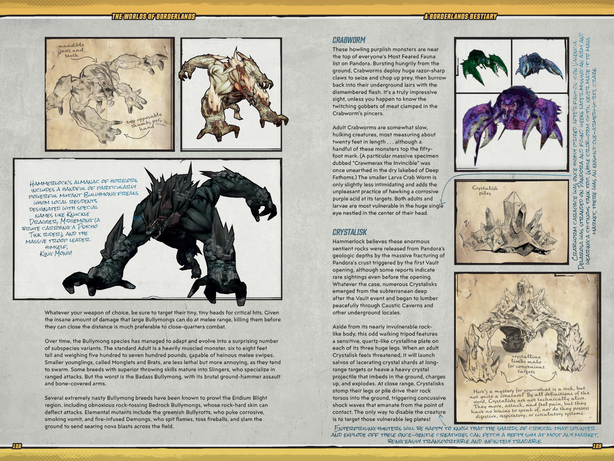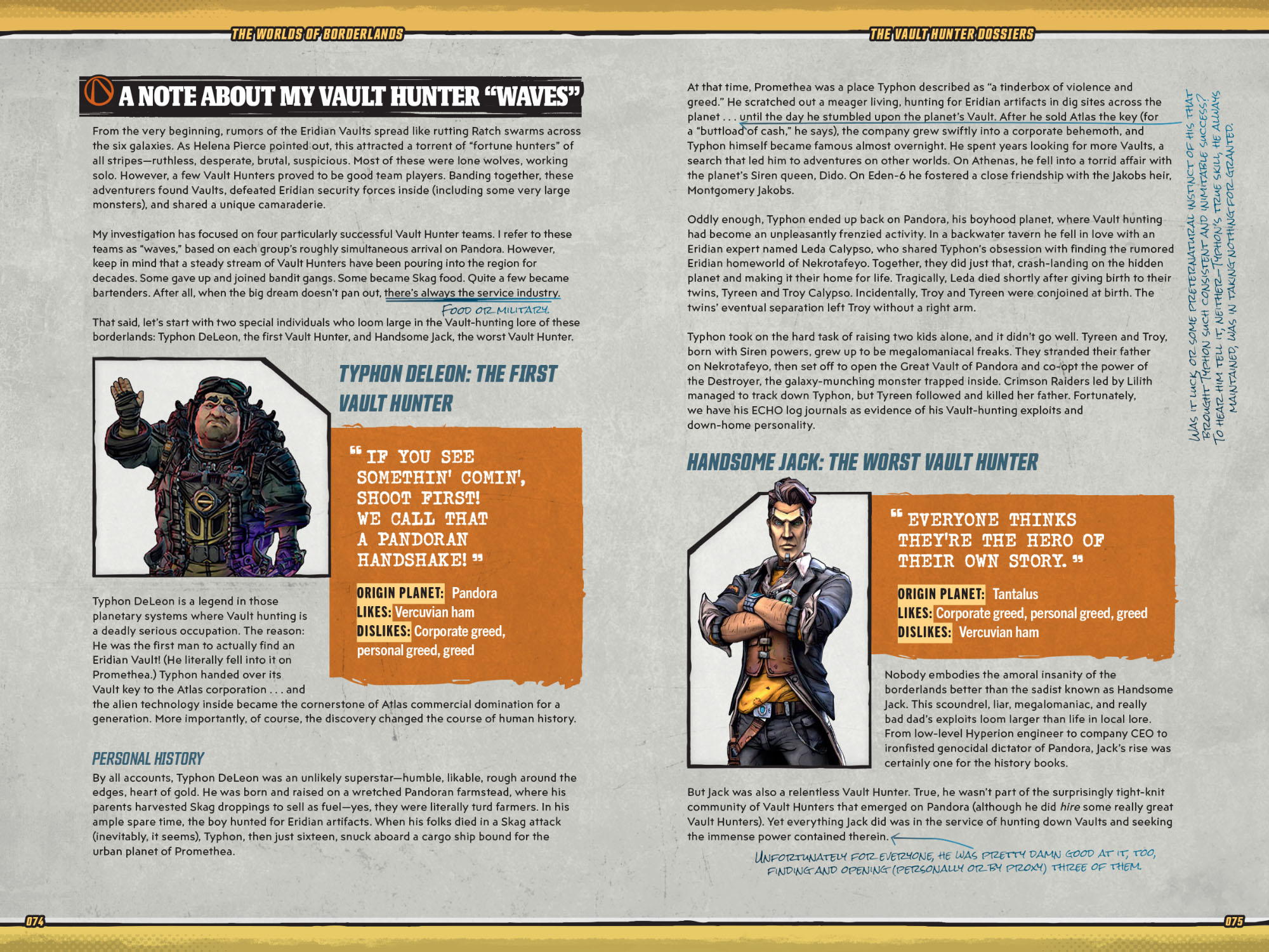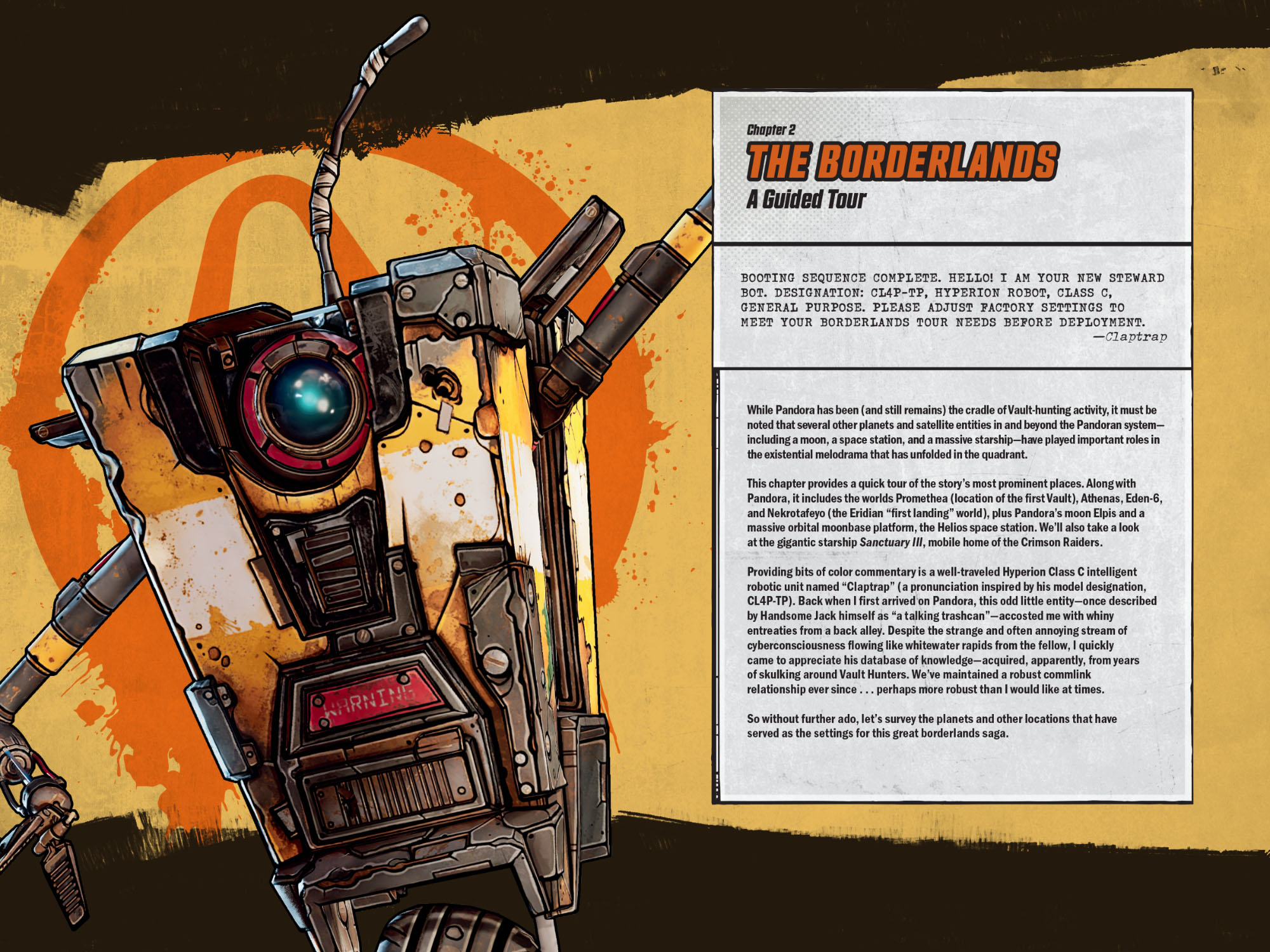 The universe of Borderlands is an inhospitable wilderness that spans every biome conceivable. It's also a land full of opportunity, but only if you have wits, skill, and guns. Lots of guns. Many come to Pandora in search of the Vault in the hopes of finding wealth, fame, or power. This is the definitive guide to the bold people who live there and in the surrounding galaxy, the mercenaries, monsters, and wilds they contend with, and the ridiculous arsenal they employ.