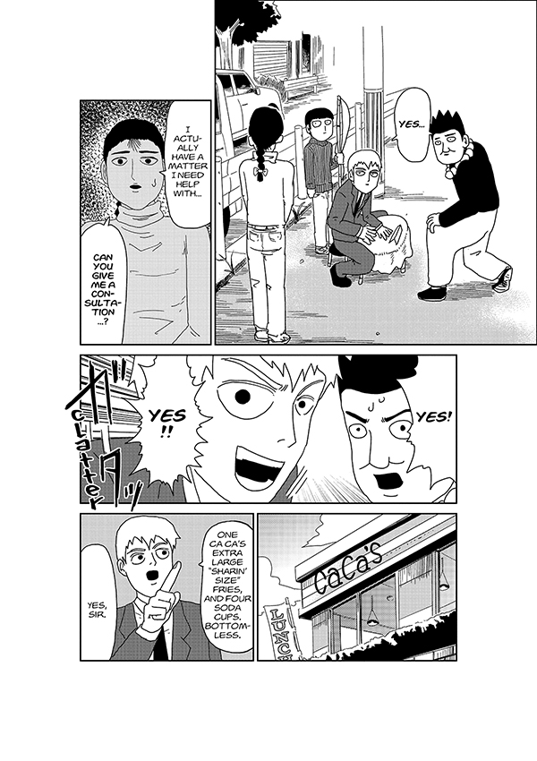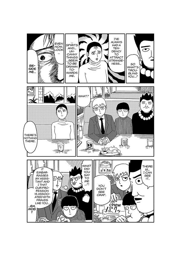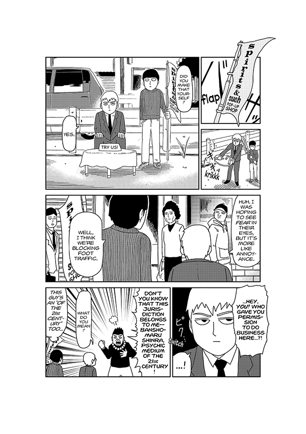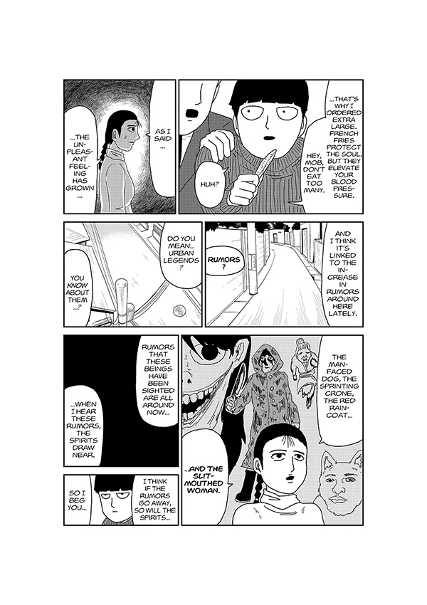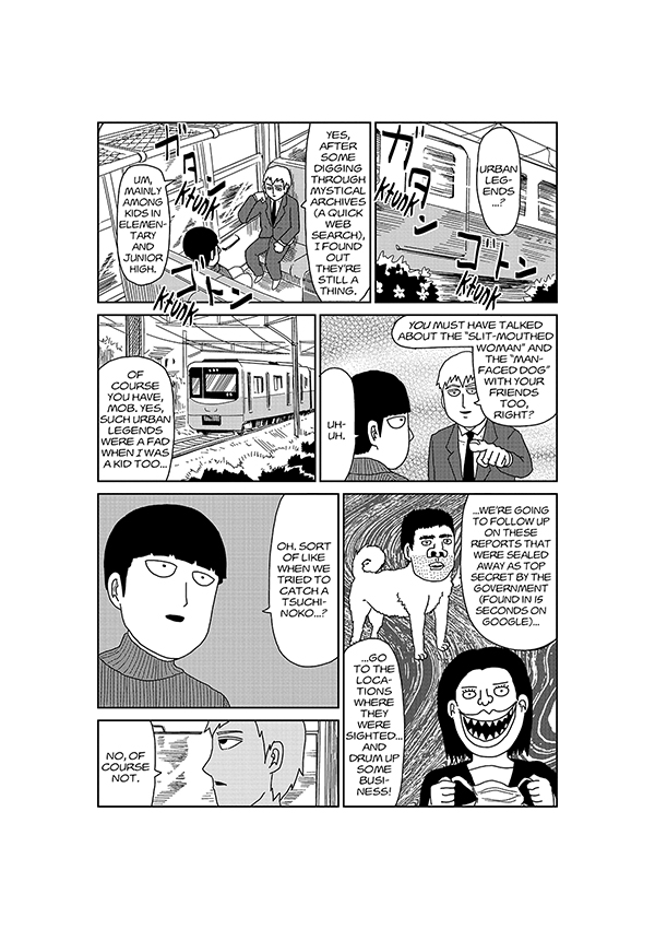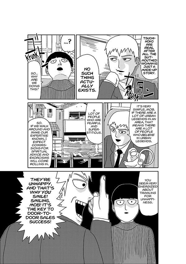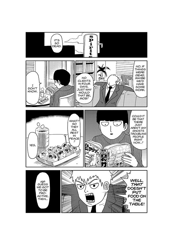 It's back to business at Spirits & Such . . . but since it seems all the ghosts are resting in peace recently, business is dead, too! But if jobs won't come to them, they'll just have to go out and meet trouble halfway . . . which is why Reigen's taking Mob to a town filled with urban legends, and why Reigen and Mob make a clandestine trip to meet clients at an exclusive girls' school . . . in disguise, dressed in ponytails and sailor skirts!