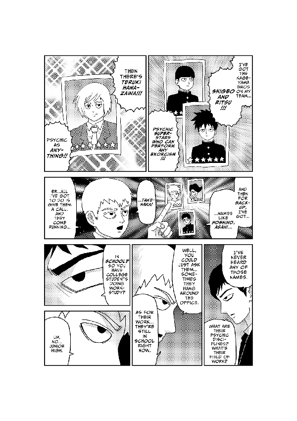 In a world haunted by dangerous supernatural forces, there are still some problems you can't solve no matter how much spiritual power you have. And a good thing too--because phony exorcist Reigen Arataka doesn't have any! But that's never stopped Reigen from running a ghost-busting business . . . and his new part-time office assistant is none other than Tome Kurata, a girl obsessed with the strange and unexplained--and the schoolmate of Reigen's protege, Shigeo ''Mob'' Kageyama. Yet whereas Mob's incredible psychic strength resolved many a case for Reigen, Tome is as powerless as her boss! Or so she may think at first . . . but if there's one thing a master scam artist knows how to teach, it's the power of confidence and belief!
