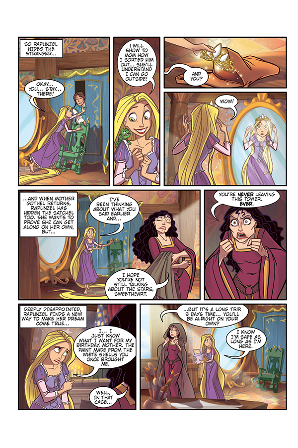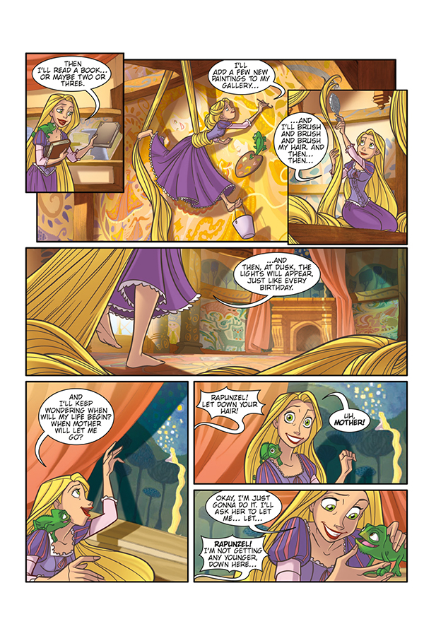 Experience the magic and charm of Rapunzel in this graphic novel retelling of Disney Tangled. Locked away from the world in a tower, Rapunzel yearns for freedom and adventure. In a chance encounter, she meets a bandit who becomes an unlikely partner. Together, they make their way to the kingdom where they discover Rapunzels true identify and find that dreams do come true!