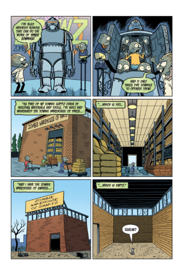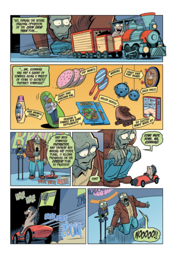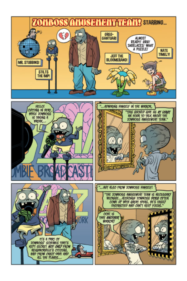 A behind-the-scenes look at the secret schemes and craziest contraptions concocted by the bizarre Zomboss, leader of the zombie army, as he proudly leads around a film crew from the Zombie Broadcasting Network. Crazy Dave has some silly schemes and convoluted contraptions of his own to protect Neighborville's citizens. With his niece Patrice, neighborhood hero Nate Timely, and his own army of powerful plants and strange inventions, Dave's ready to counter any frightening invasion that Zomboss can think up! Eisner Award-winning writer Paul Tobin teams up with artist Jesse Hamm for a brand-new Plants vs. Zombies graphic-novel adventure!