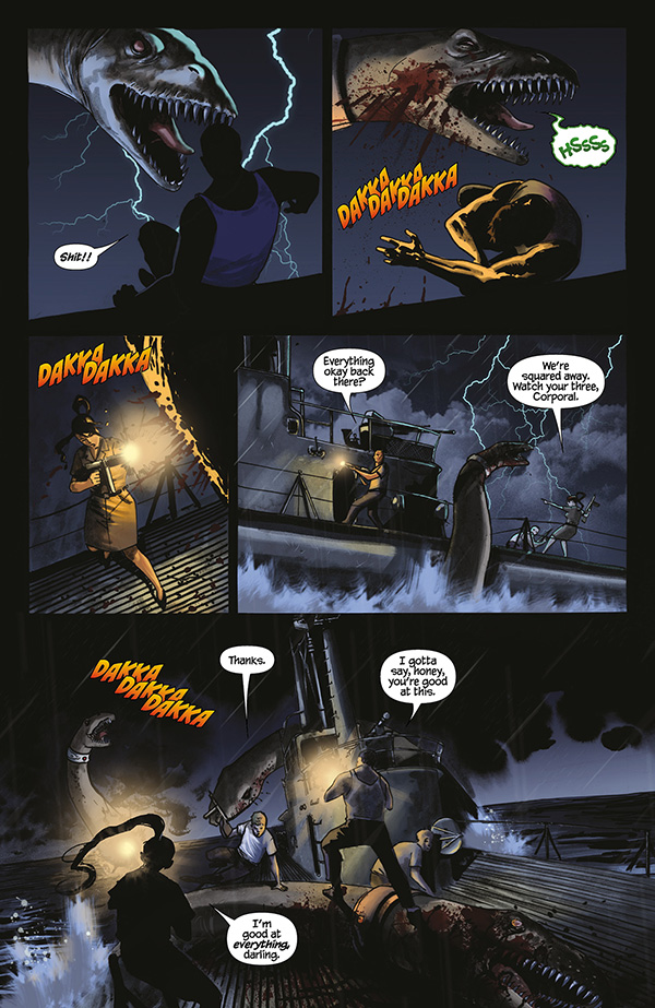 WWII. The Pacific. A mythic adventure unfolds as three American soldiers--a disgraced ex-cop, a mobster trying to escape his past, and an intelligence officer with mysterious motives--investigate a top-secret Japanese superweapon: a deadly force of trained dinosaurs!
