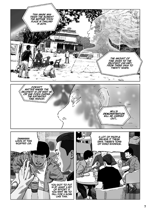One day, you will receive a message from an unknown sender. The message will only include your name, the fact that you are going to hell, and the time you have left to live. When the time counts down to zero, supernatural beings manifest to condemn you to hell. Amid social chaos and increasing hysteria, the people must find a way to survive this inexplicable terror.