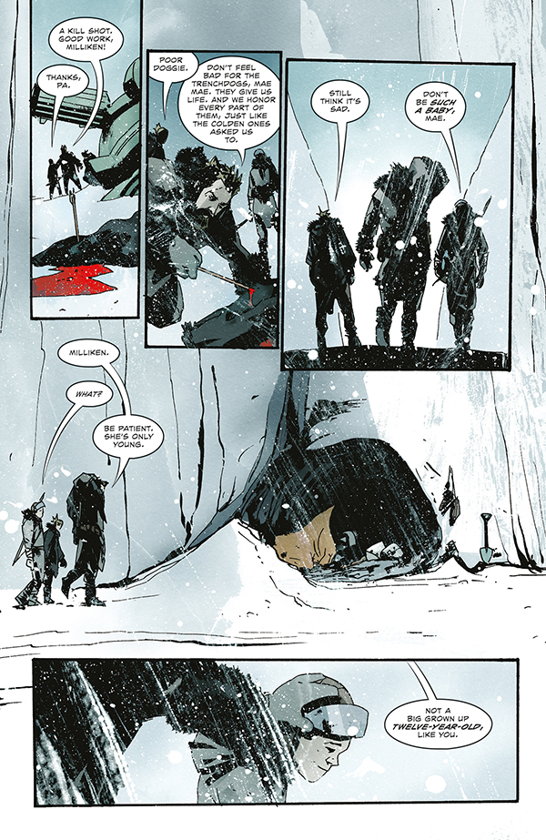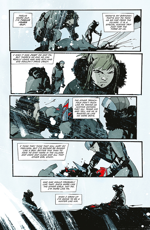 Milli and Mae don't really know how their people came to live here. No one does, not even their wise and gentle Father. On Milliken's twelfth birthday, their father takes the two girls on an overnight skate down the trench--a coming-of-age ritual to teach them how to fish the frozen river, how to hunt the wild Trenchdogs that wander its frigid banks, and how to give proper thanks to their frozen Gods--The Colden Ones. It's the trip of a lifetime until the girls push beyond the borders of their humble land and awaken the Trench's deadly defender...The Snowman! What follows next is an action-packed story of survival, loss and redemption.