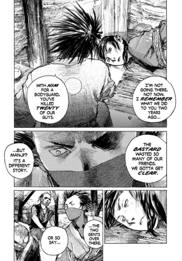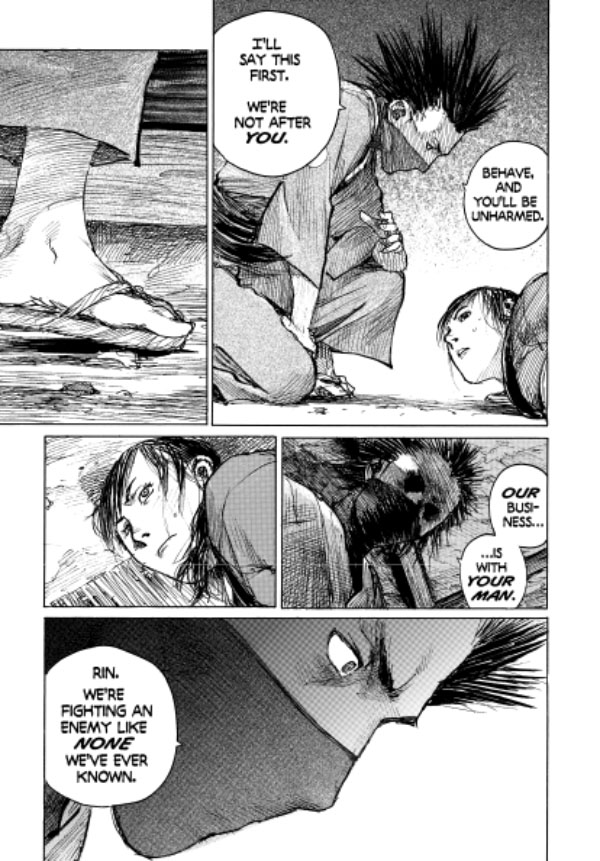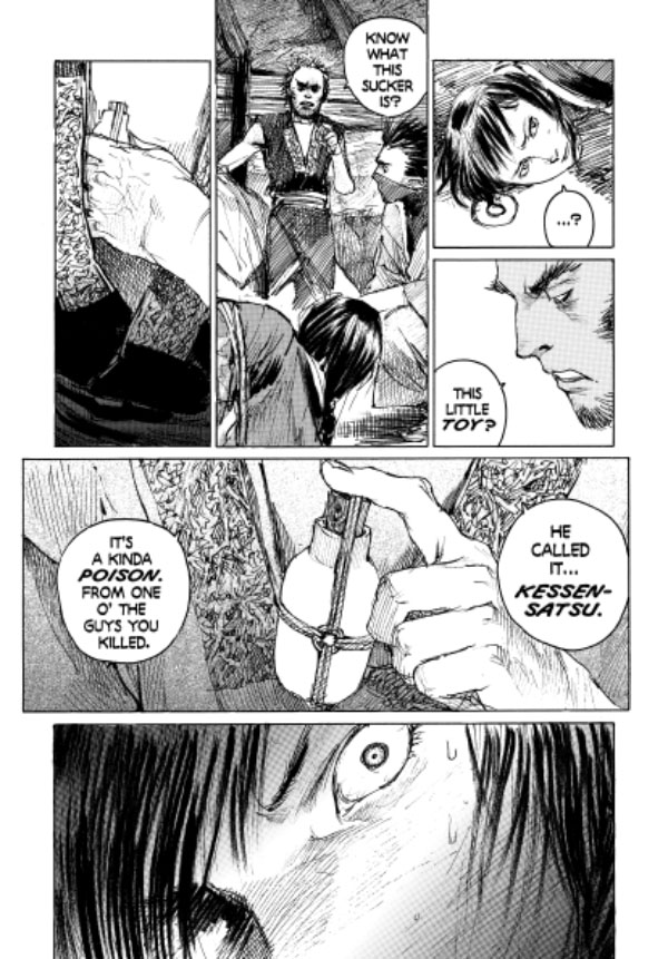 Over 700 pages of samurai swordplay and grudge matches in one killer, value-priced collection! Featuring Hiroaki Samura's fast-paced "Mirror of the Soul," "Last Blood," and "Trickster" story arcs! Kidnapped and bound by three Itto-ryu warriors, Rin is unable to warn her bodyguard, Manji--the seemingly immortal swordsman--that he's heading into a trap. The Itto-ryu thugs also possess a large dose of the only known poison to damage Manji's blood and severely cripple his regenerative abilities. And is the Mugai-ryu assassin Giichi following Manji in order to help rescue Rin . . . or will he just stick around long enough to finish off any survivors?