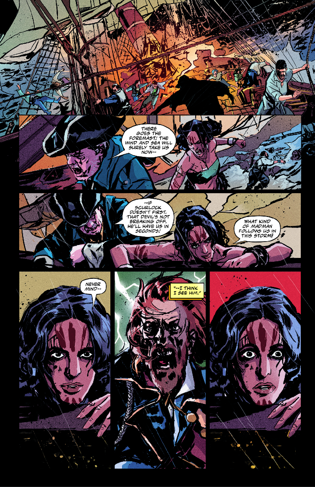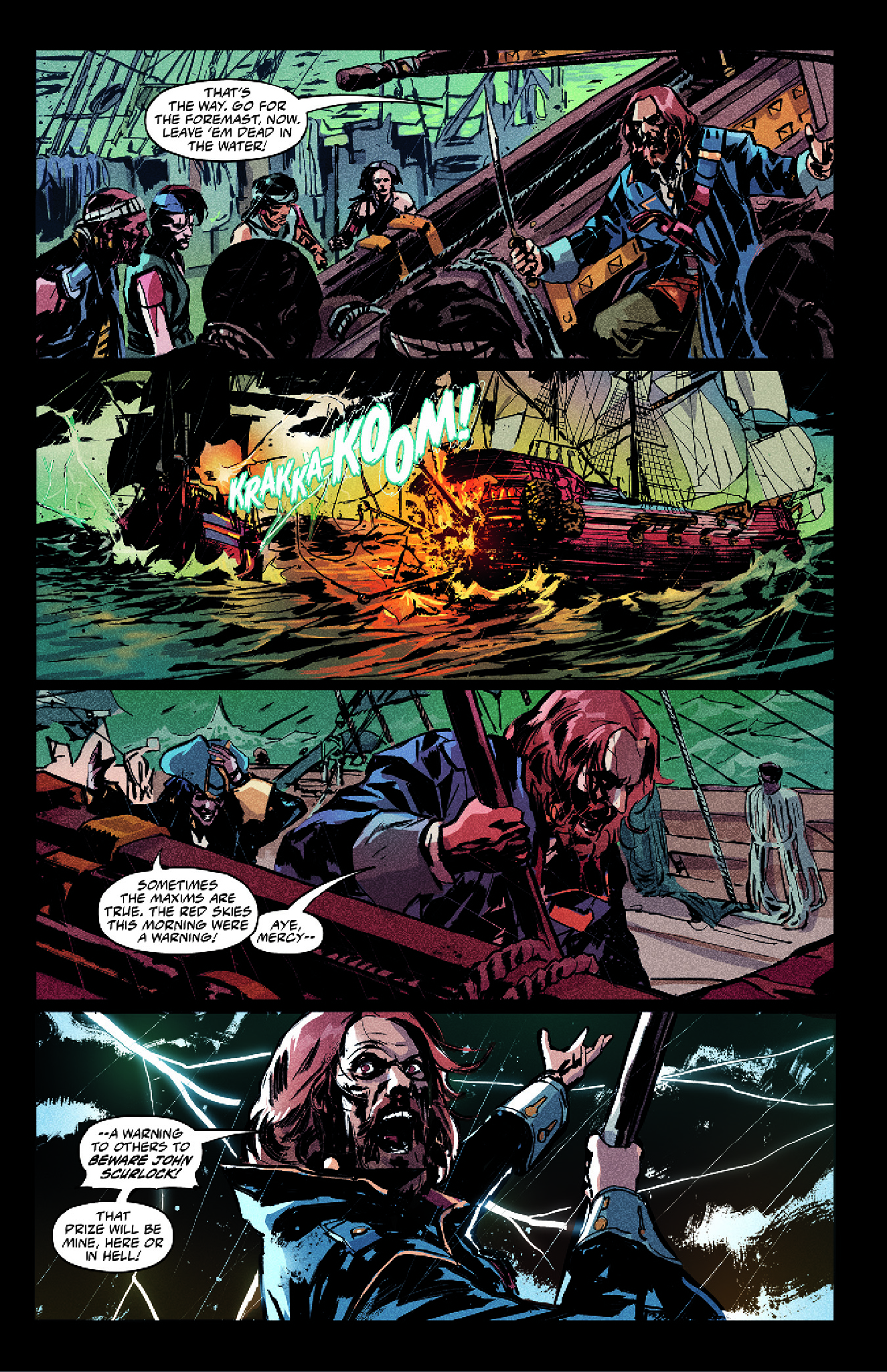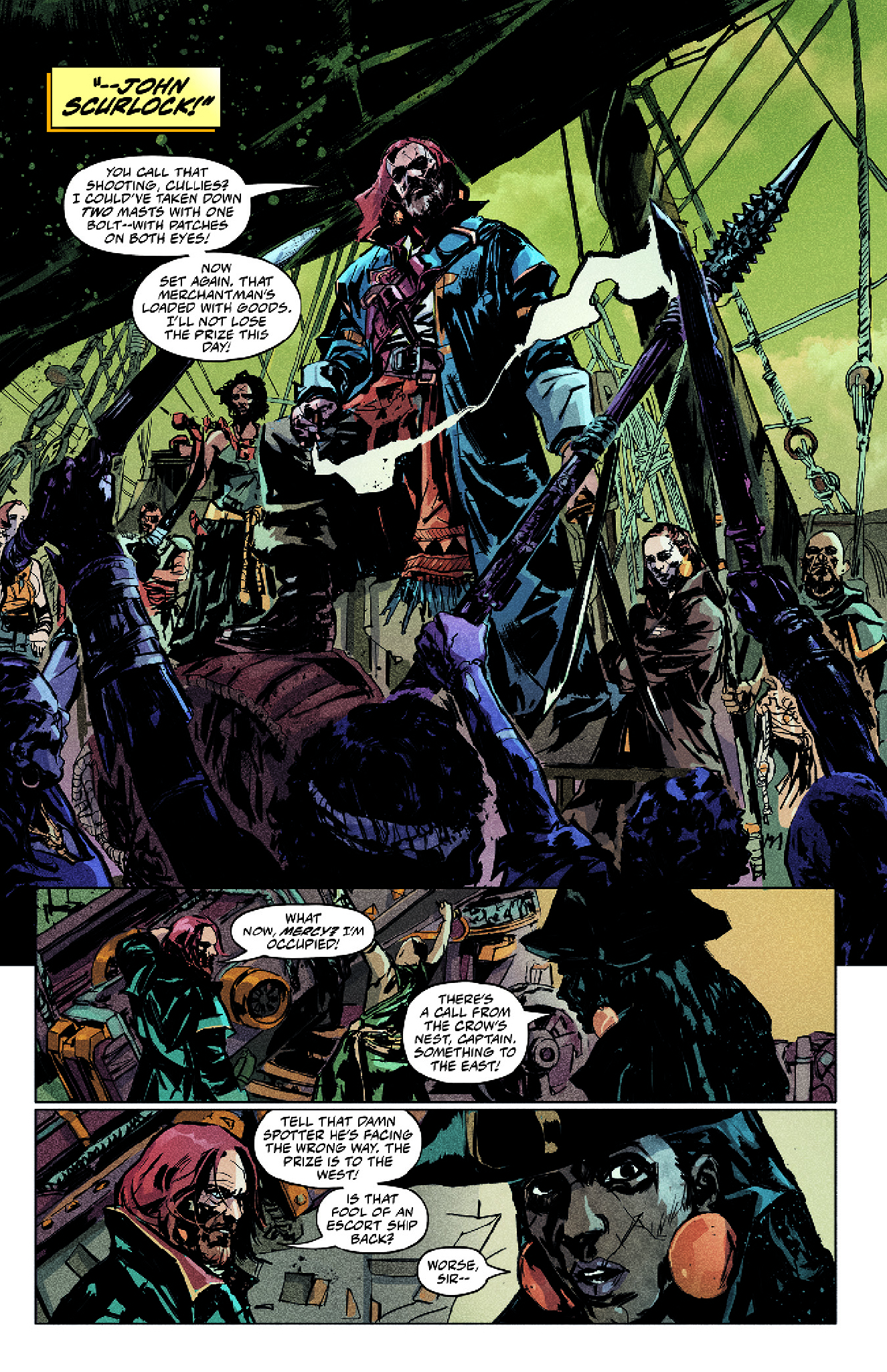 The merchant ship captain and his crew, lucky enough to have survived the savage storm, scramble to hide what is left of their precious cargo before the surviving pirates overtake them. When it seems the marauders have won the day, a powerful no-nonsense admiral and her crew step in to join the fray. She informs everyone that there is yet a more dangerous threat on the horizon; a murderous mercenary known across the seven seas as "The Wolf Hunter".