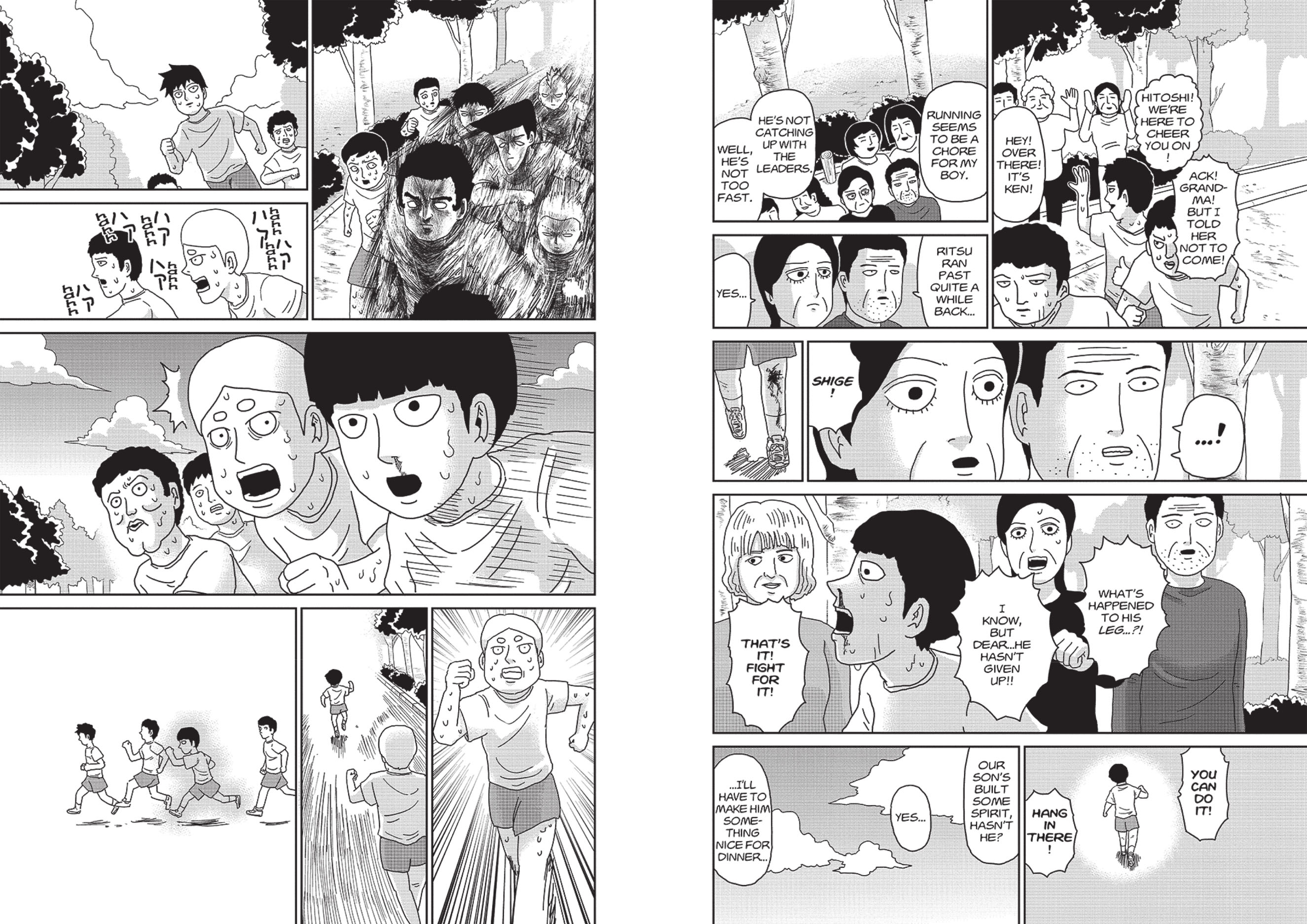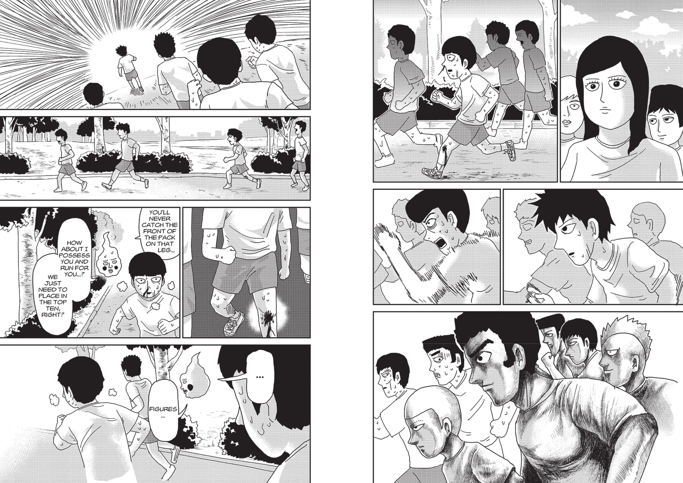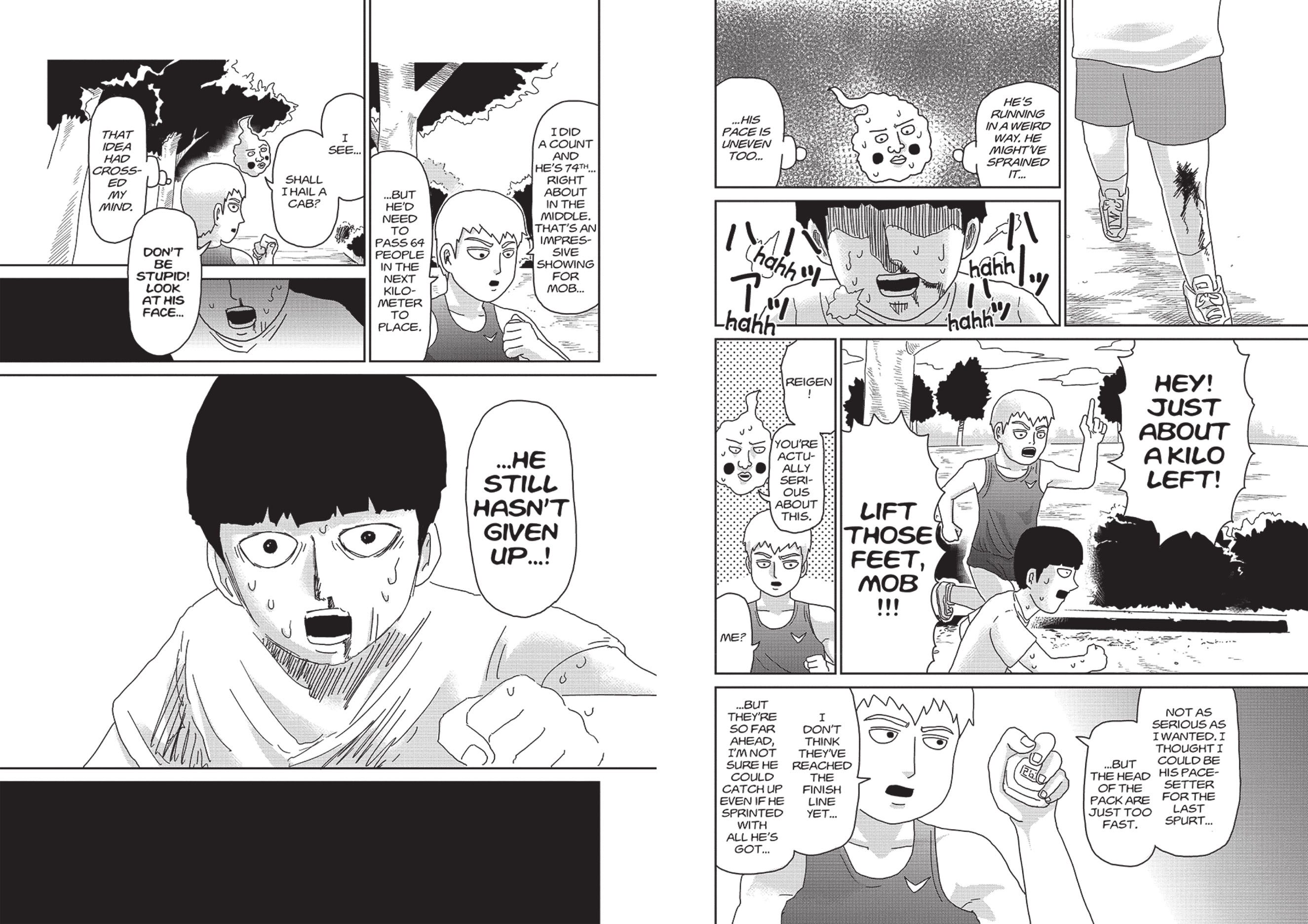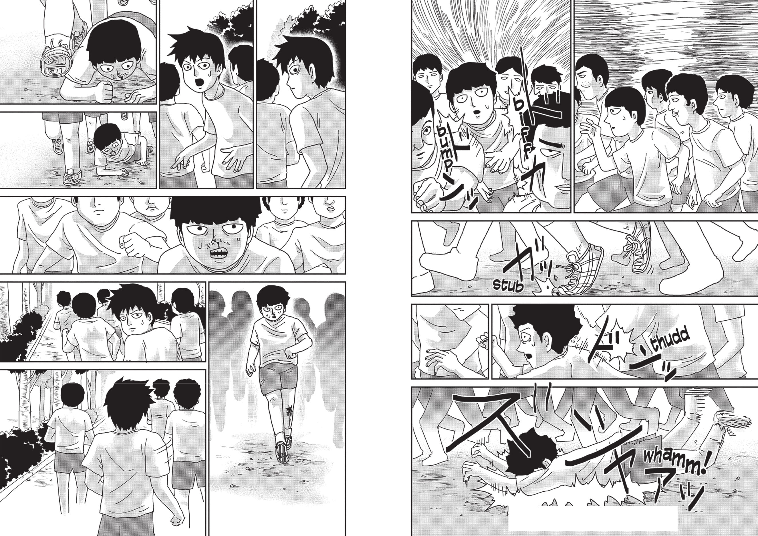 Mob struggles hard through his first marathon, nearly making it all the way before passing out! He doesn't feel too bad headed back home . . . but finds while he was gone, something terrible has happened there. If Mob believed he was through with the shadowy organization Claw, he was wrong . . . and with Mob's emotions and strength at max, it's superhuman war in the streets as Claw plans a terrorist attack the authorities can't stop--because it'll be carried out by psychic power!