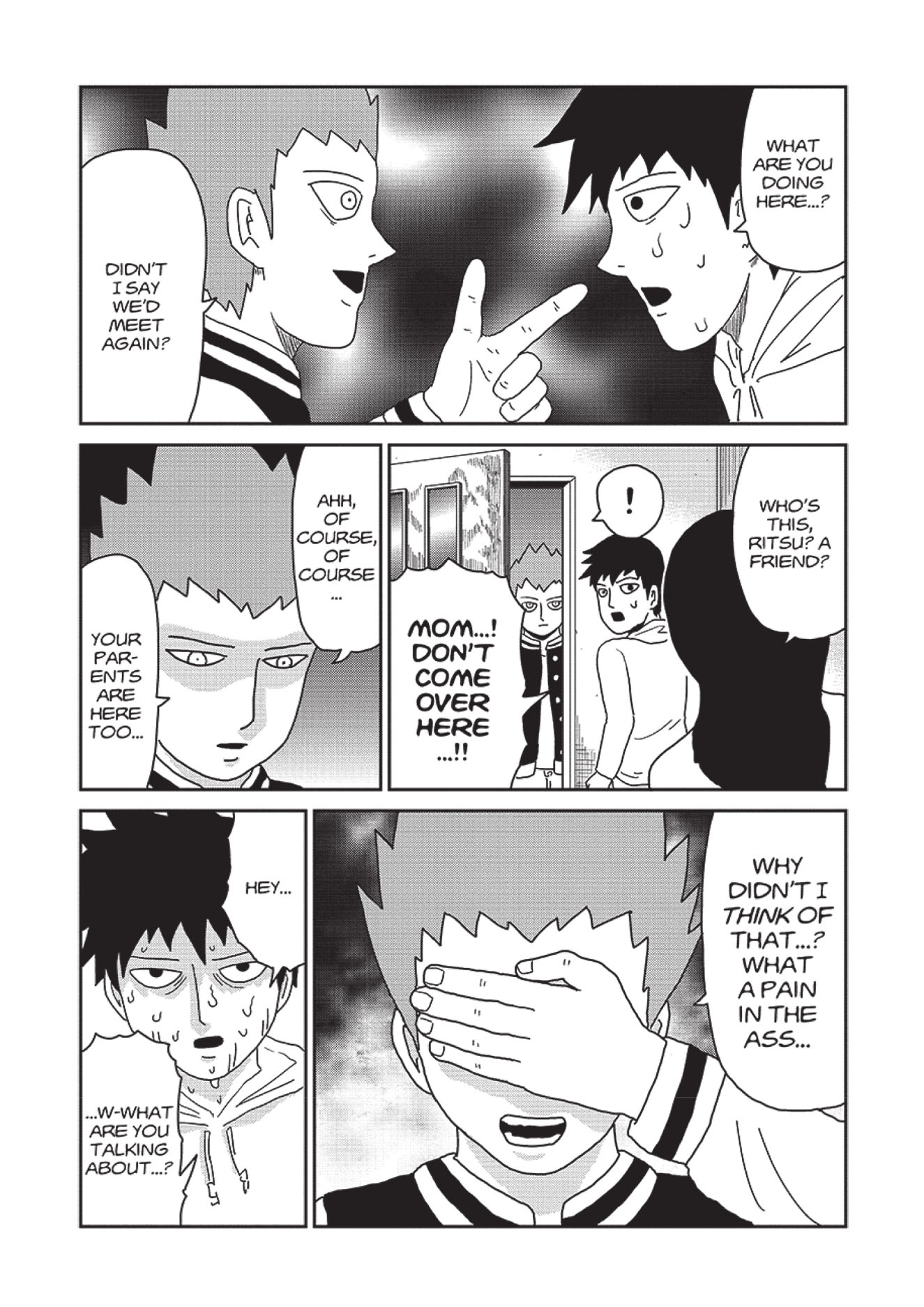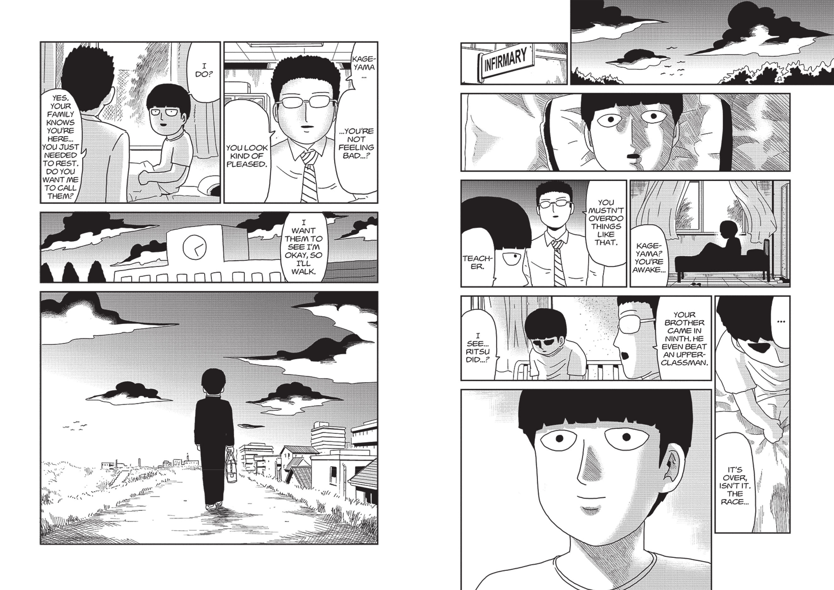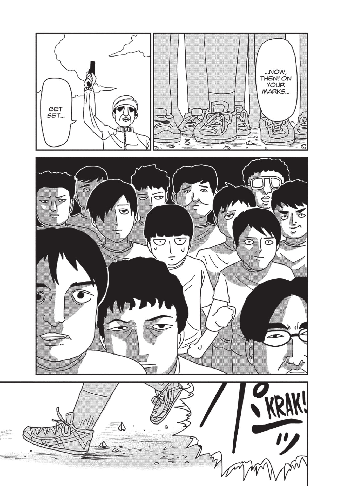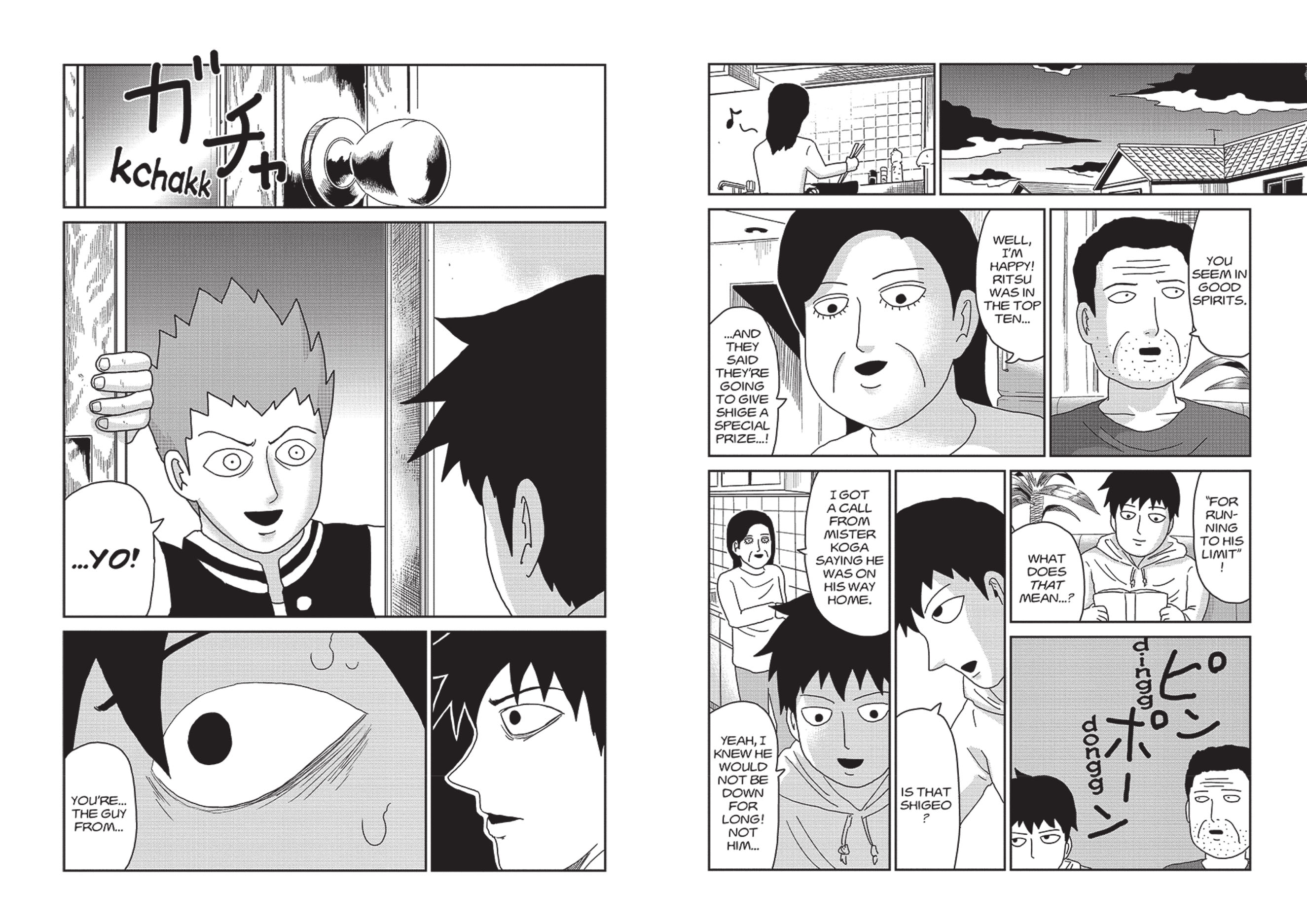 Mob struggles hard through his first marathon, nearly making it all the way before passing out! He doesn't feel too bad headed back home . . . but finds while he was gone, something terrible has happened there. If Mob believed he was through with the shadowy organization Claw, he was wrong . . . and with Mob's emotions and strength at max, it's superhuman war in the streets as Claw plans a terrorist attack the authorities can't stop--because it'll be carried out by psychic power!