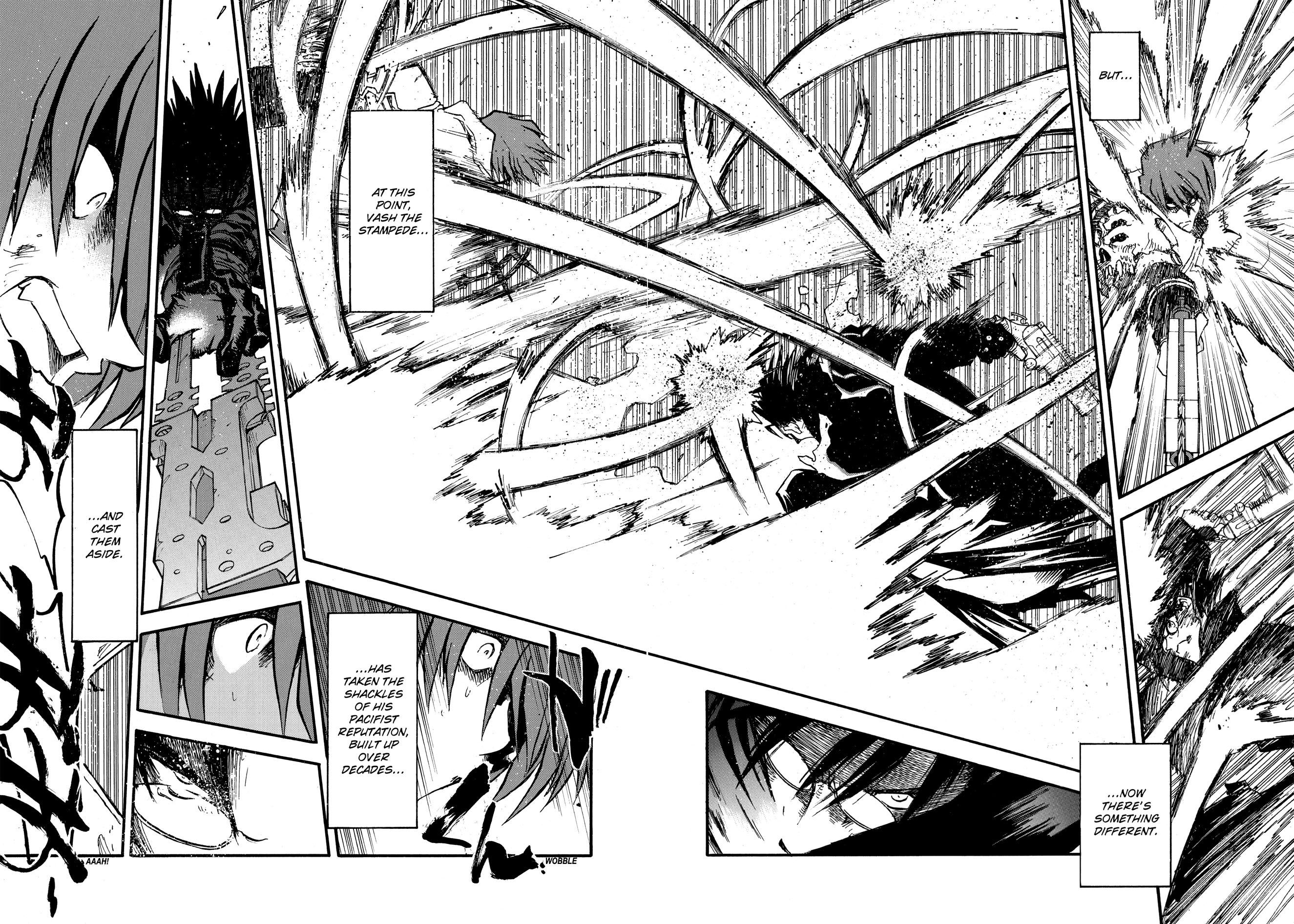 With Vash the Stampede’s brother Knives’s power growing exponentially, and the shattered wreckage of Earth’s space fleet littering the planet Gunsmoke, Vash must lay everything on the line to prevent the apocalypse his crazed brother is determined to deliver! Holding nothing back, Vash goes toe-to-toe with Knives in a final cataclysmic confrontation, with the future of humanity and his home planet hanging in the balance.