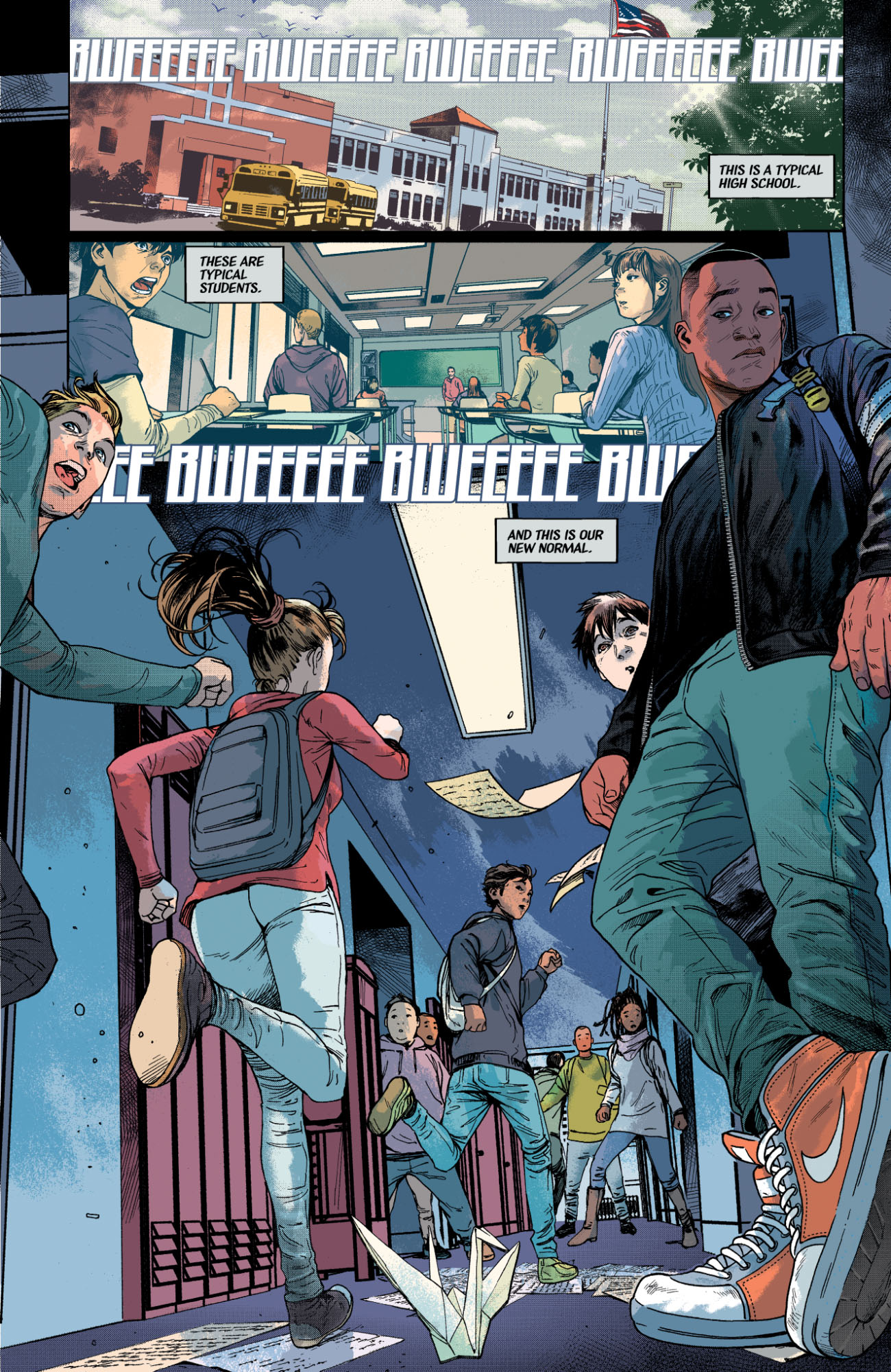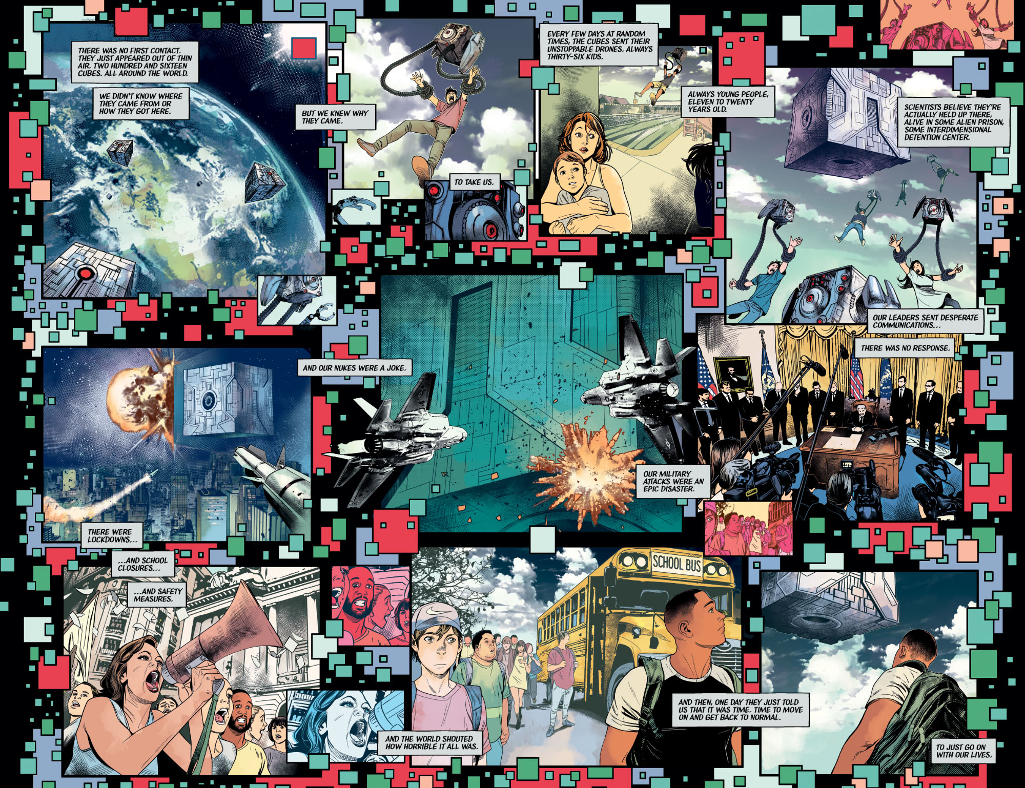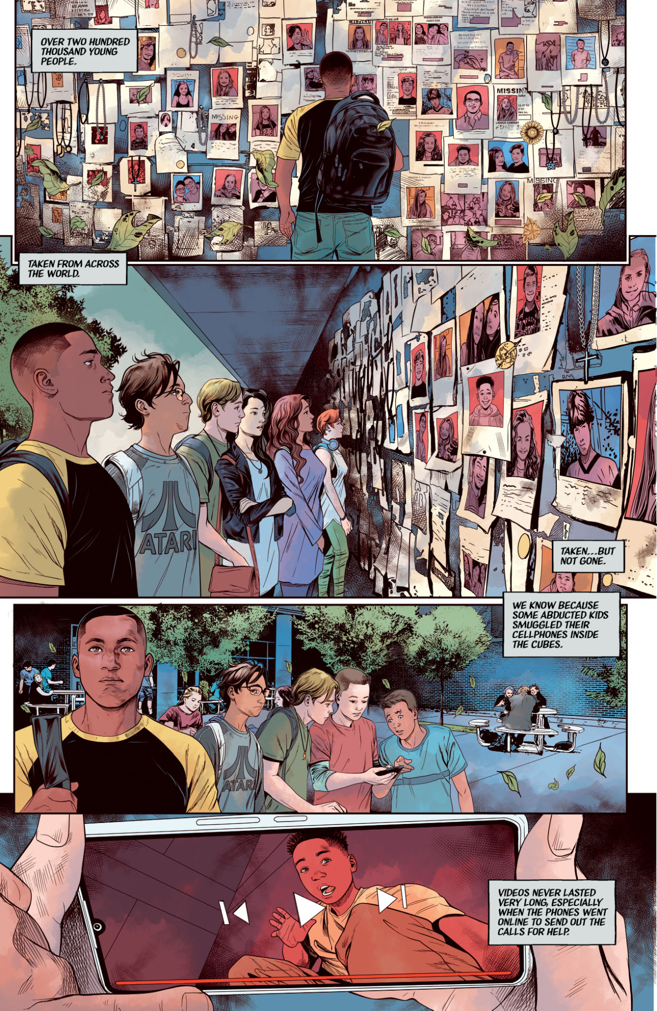 Mysterious and massive Cube spaceships from another dimension materialize over our cities around the globe. They routinely abduct teenagers to be held inside their floating prison ships. And the world accepts it as inevitable. But not Liam Watts. His younger brother has been taken. And Liam is tired of "thoughts and prayers." Now, in a "take back our future" anthem, Liam must assemble a skilled team of ordinary high school students and in just a few weeks, they must plan a heist to infiltrate the hi-tech spaceship a mile in the sky. But what they'll find there will throw their plans into turmoil and challenge their resolve. How do you break out of a prison that's not even from this world? Collects the four-issue miniseries.
