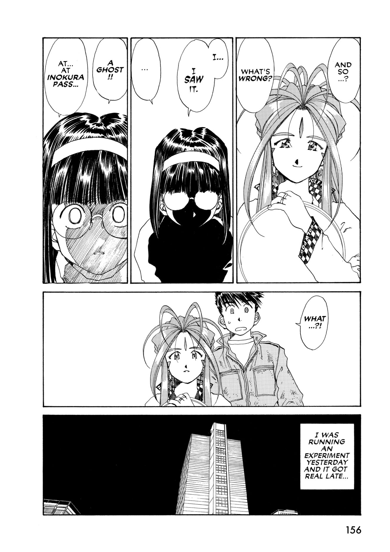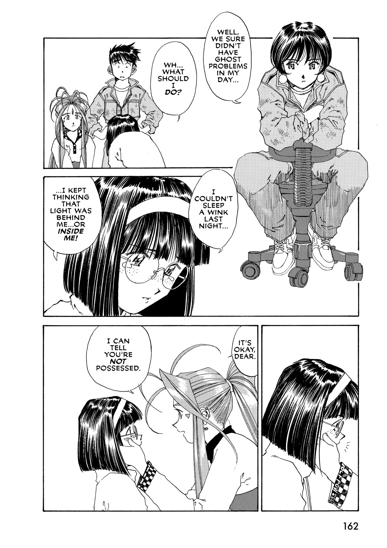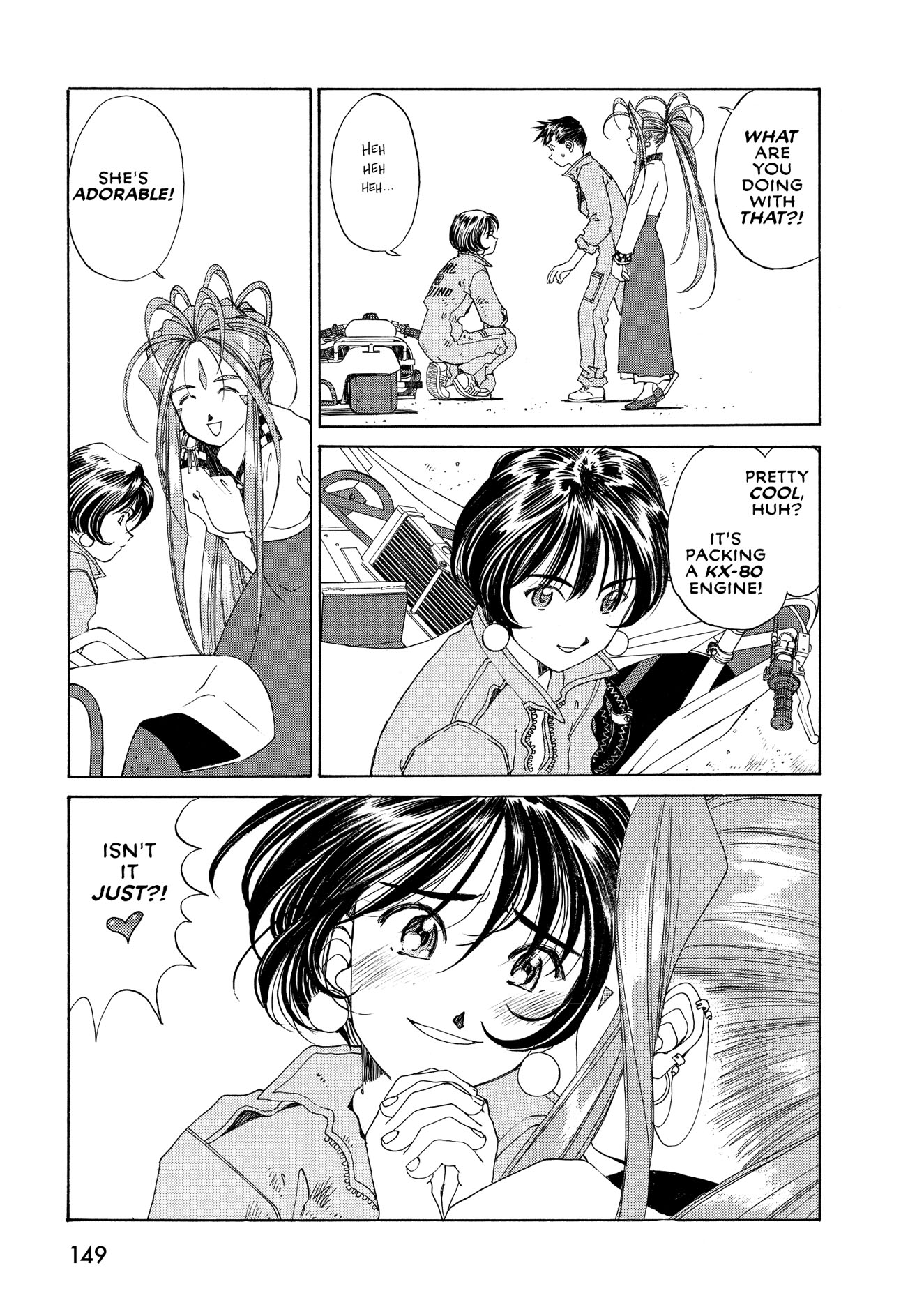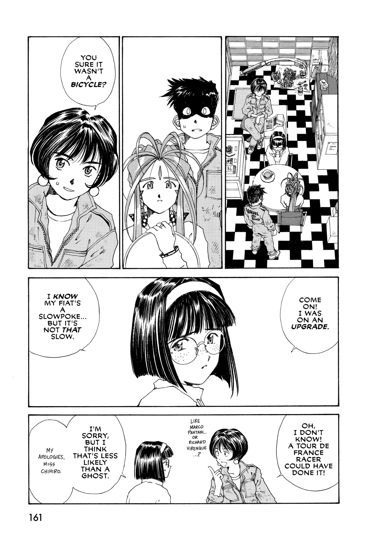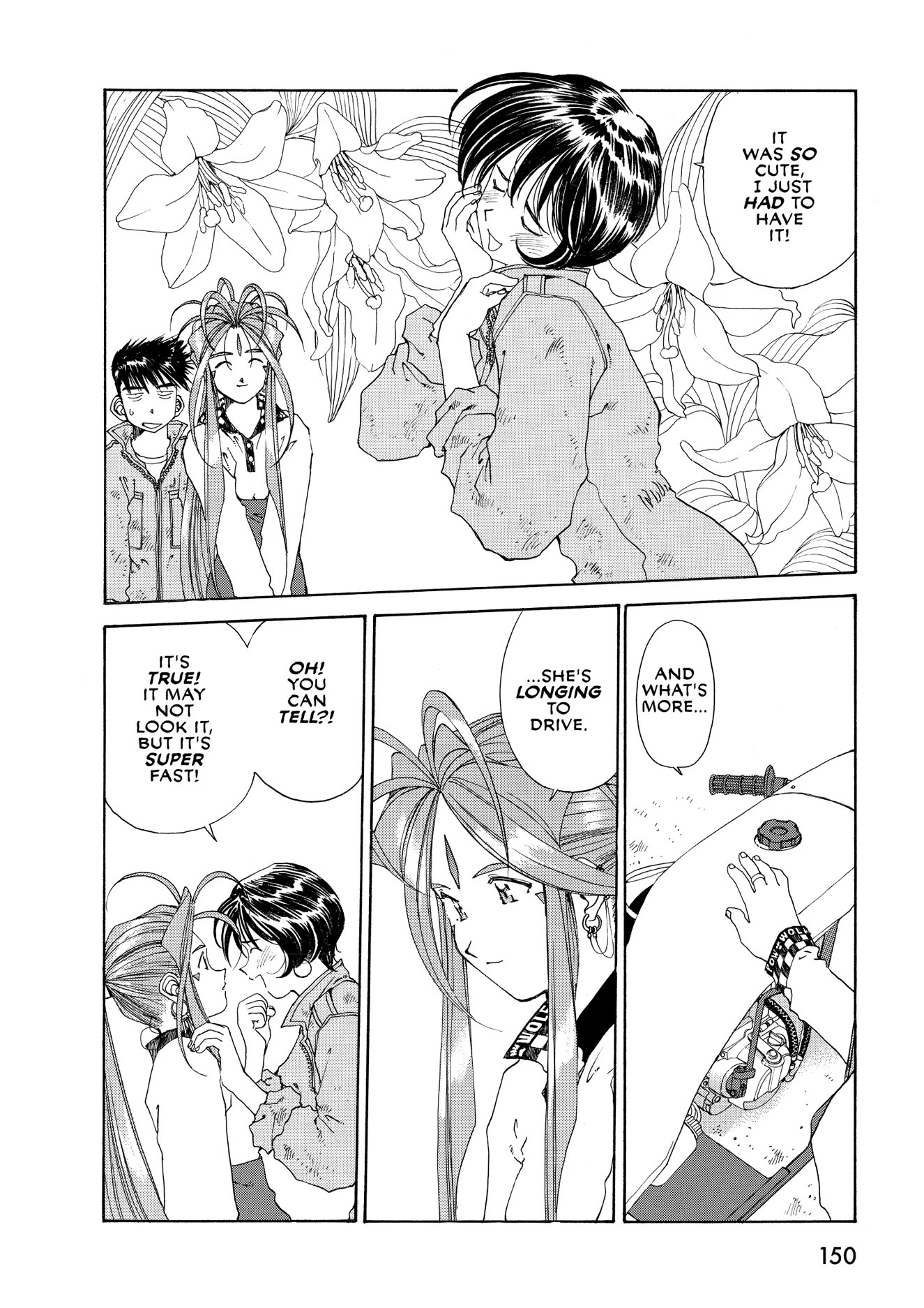 Domestic drama takes on a whole new scale--literally, as Skuld's attempt to solve their storage problems leaves Belldandy and Keiichi trapped in a living room that's now infinite square feet big! Once those household worries are wrapped up, the couple hit the road on a tandem bike for a late-night race to challenge the ghost . . . of a motorcycle, while back on campus the mad Dr. Koichi "Moreau" Morizumi drafts Keiichi and Belldandy into being the lab assistants for his latest scheme to build a walking robot that proves four legs bad, two legs much, much worse!