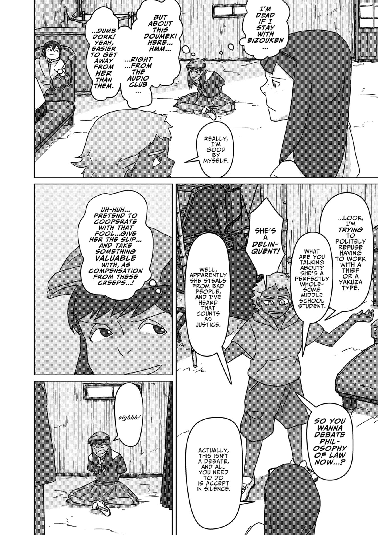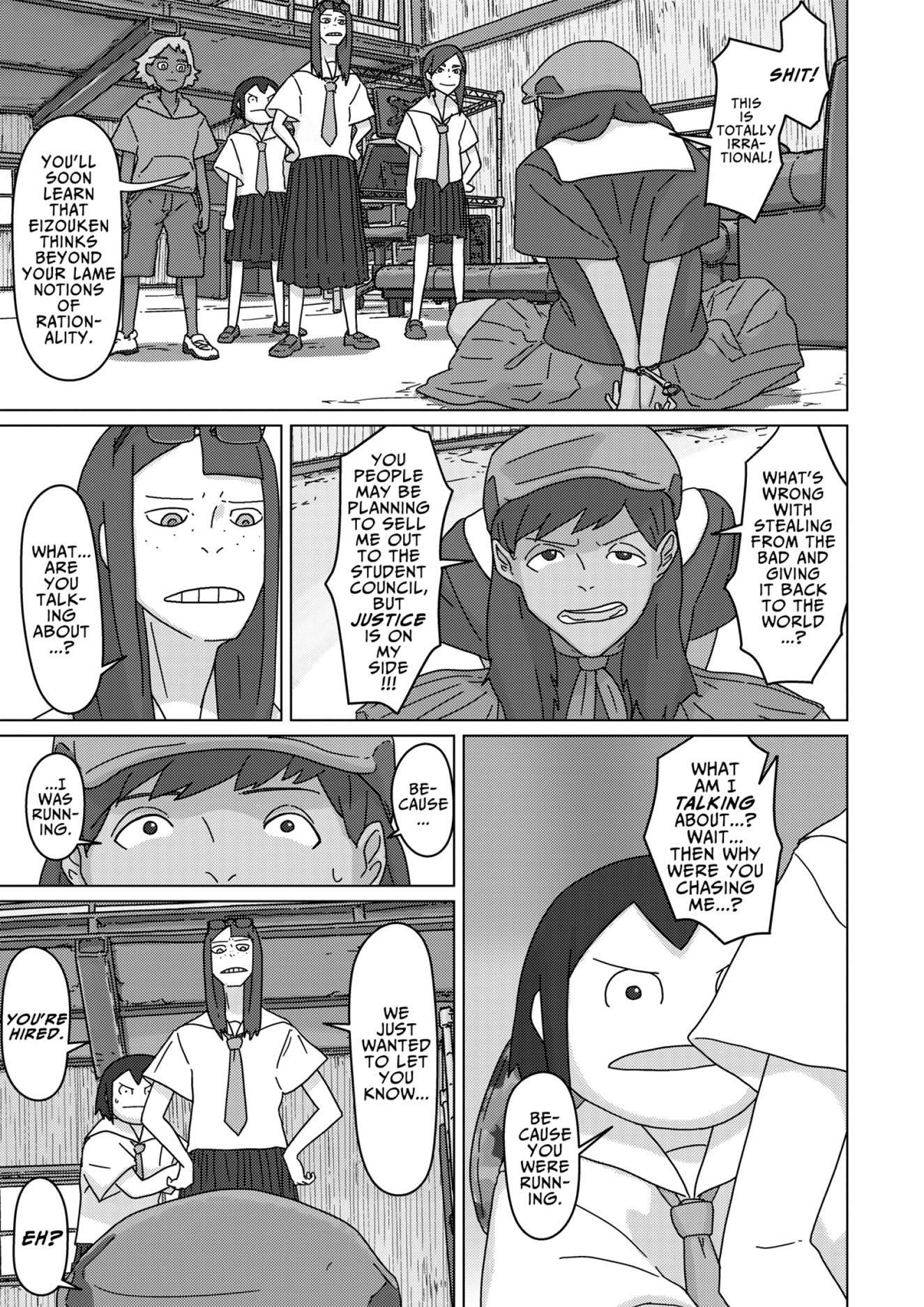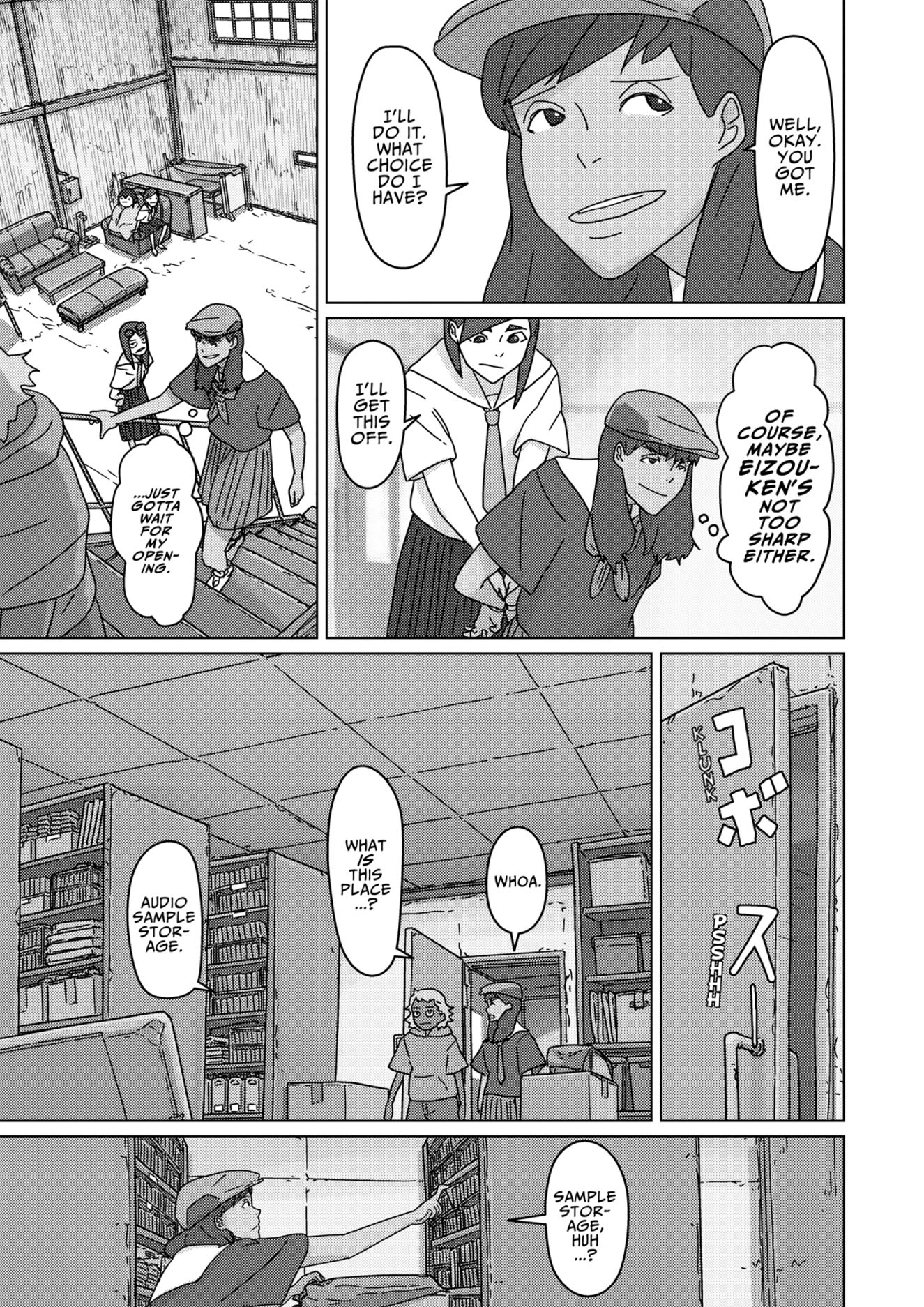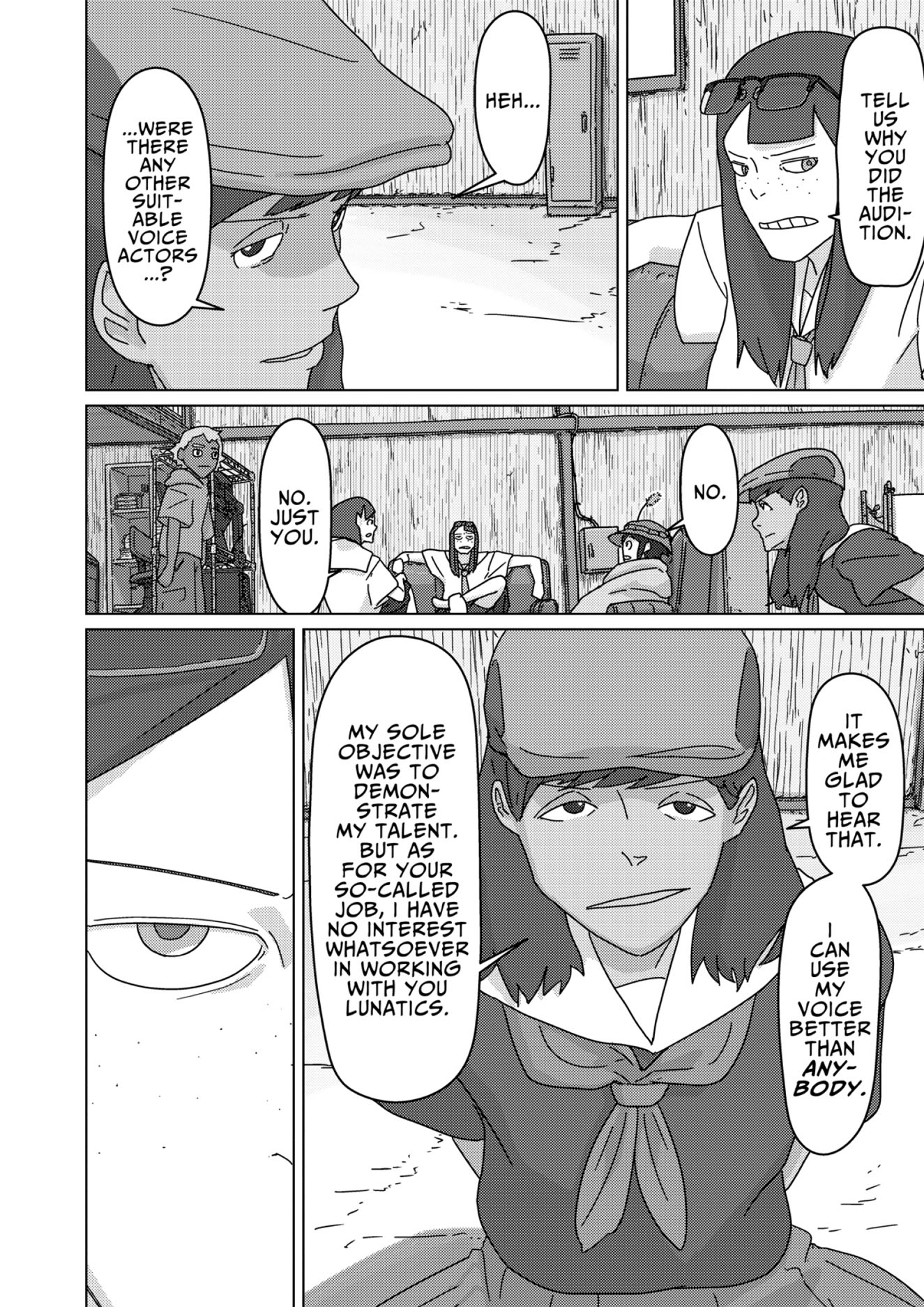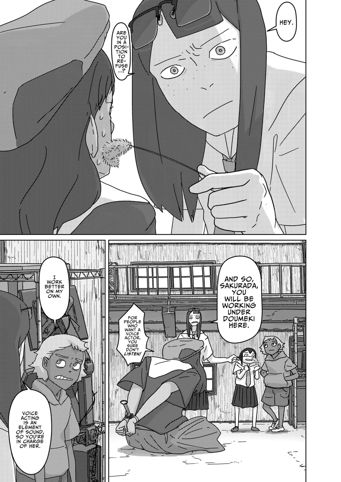 Eizouken returns to their very first short anime, Clutch That Machete With Strength!, planning to expand it into a full-length work! Mizusaki recalling the lessons she learned in her days as a child actress may provide one key to moving forward--but what about a creative challange they haven't tackled seriously yet, voice acting? At the audition, the wily Sakurada wows with her rainbow range ... but this voice acting genius is also Shibahama High's most wanted swindler!