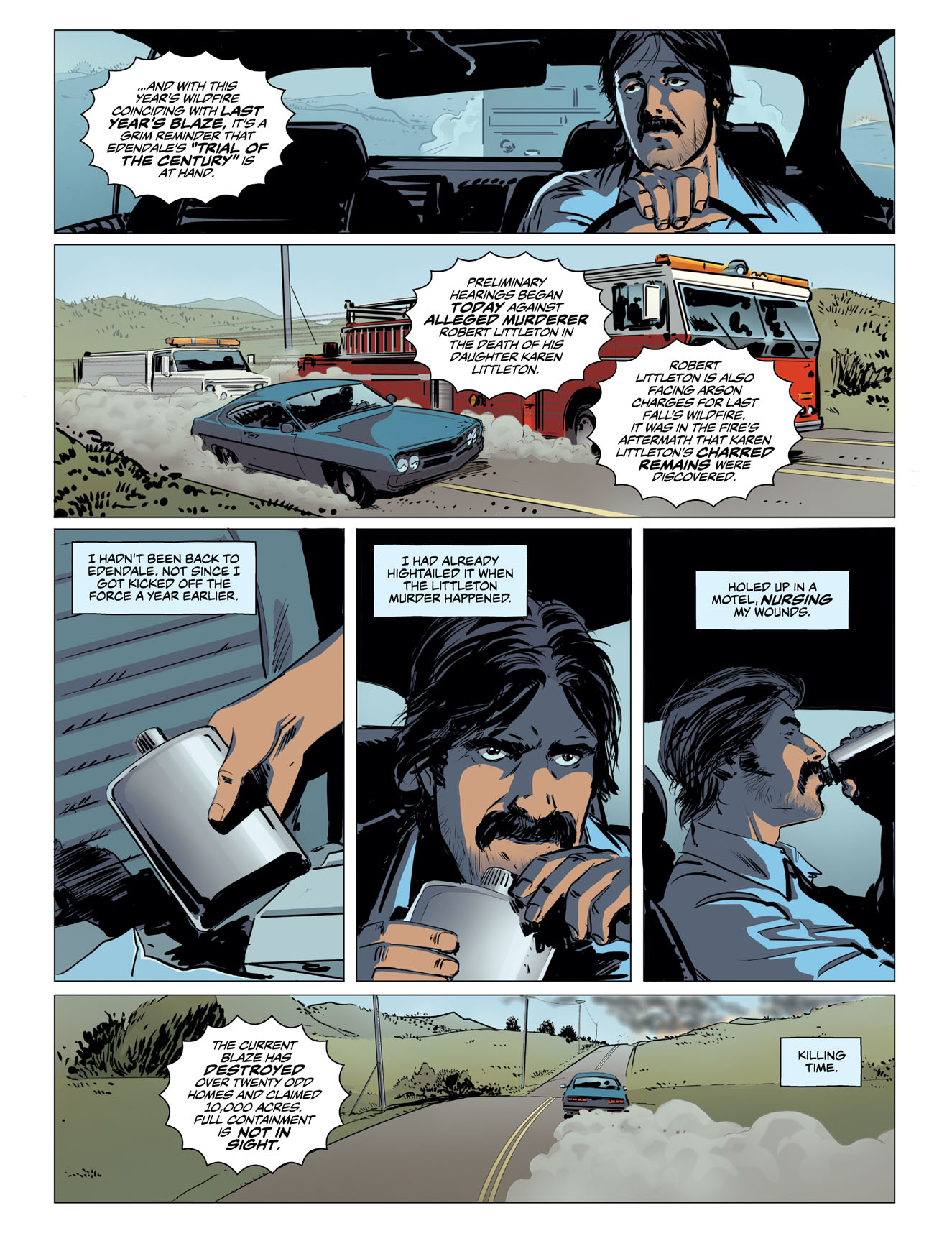 A disgraced ex-cop, Conrad, seeks redemption by unraveling an unsolved murder during Southern California's fire season. Conrad follows a lone clue—a discarded crucifix—to unravel the death of Karen Littleton, whose body was found amid a blaze that scorched 10,000 acres. The search leads him to clash with the victim's father and prime suspect, Robert Littleton, as well as hostile former colleagues on the local police force. All the while, Conrad combats his consuming alcoholism and fading faculties.