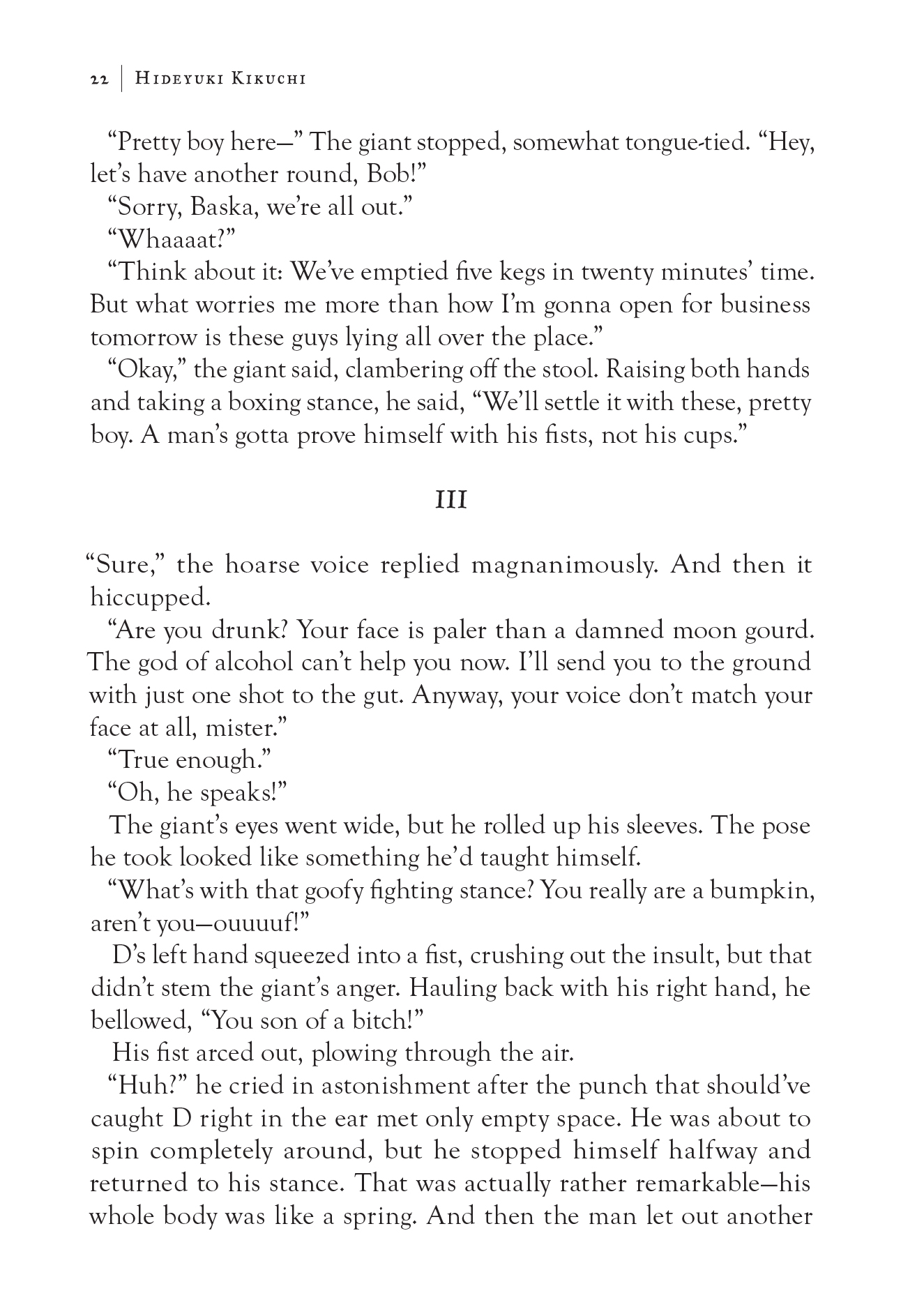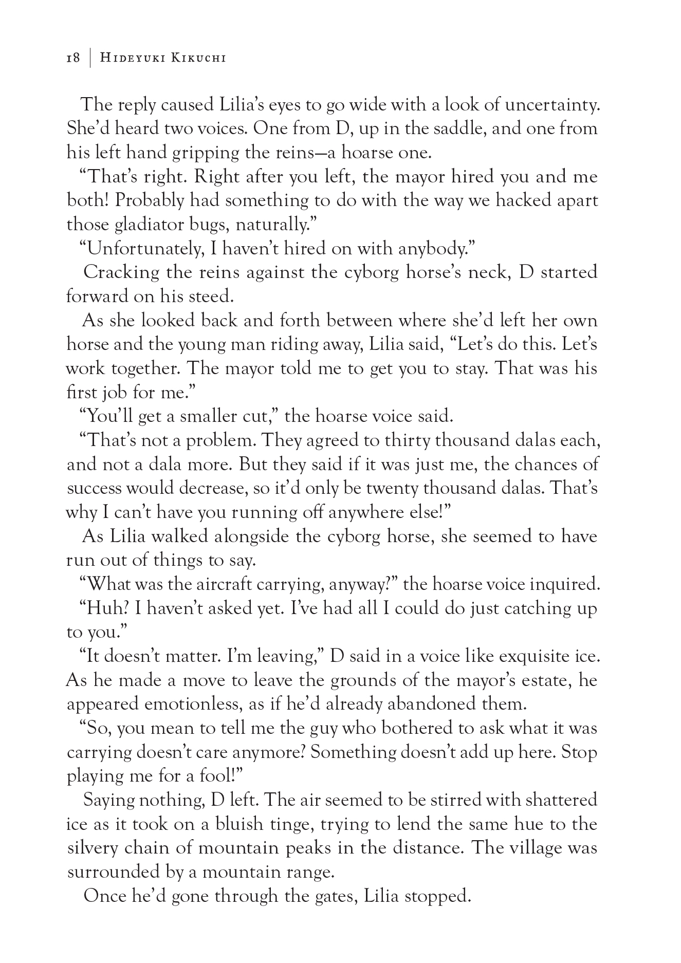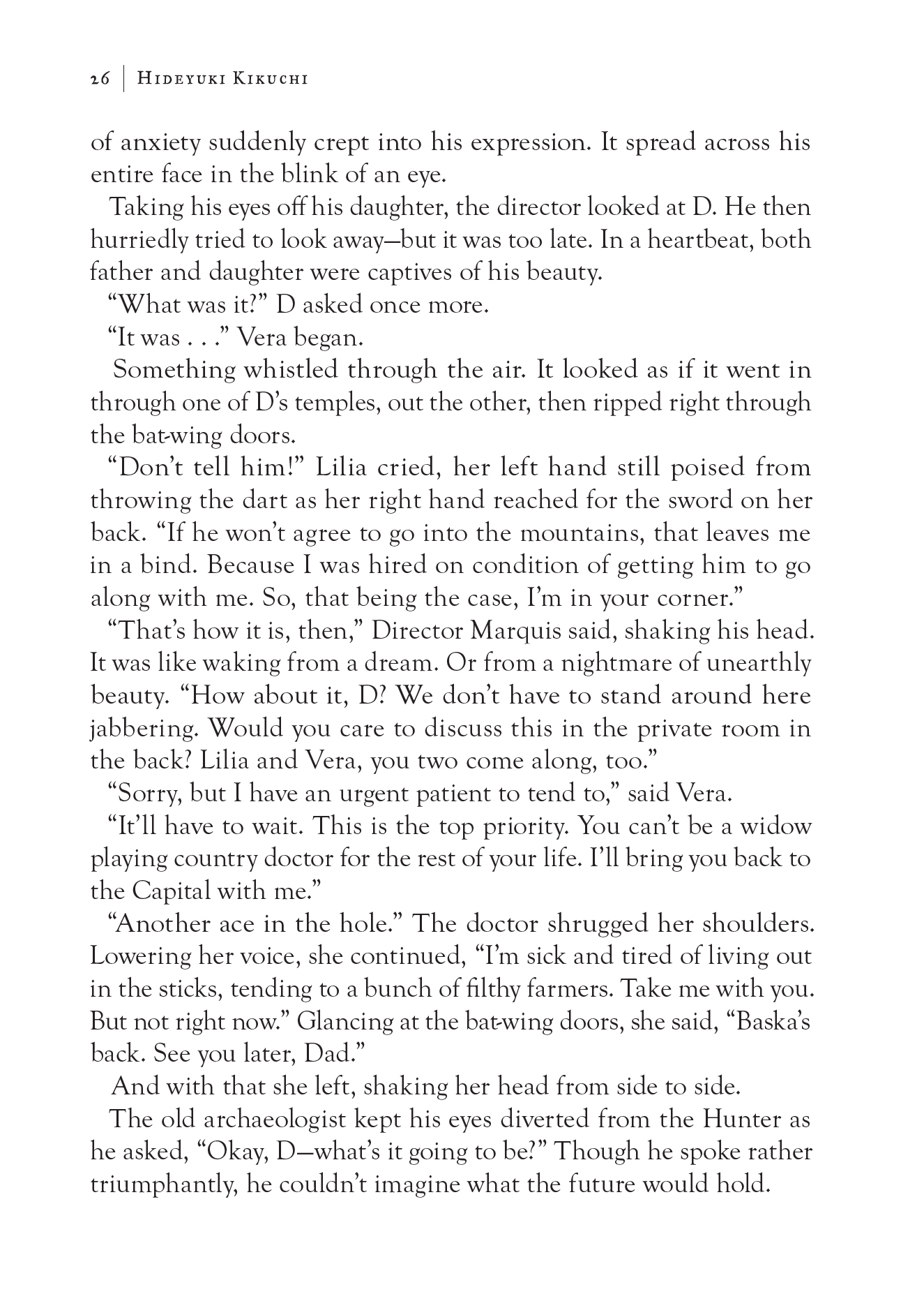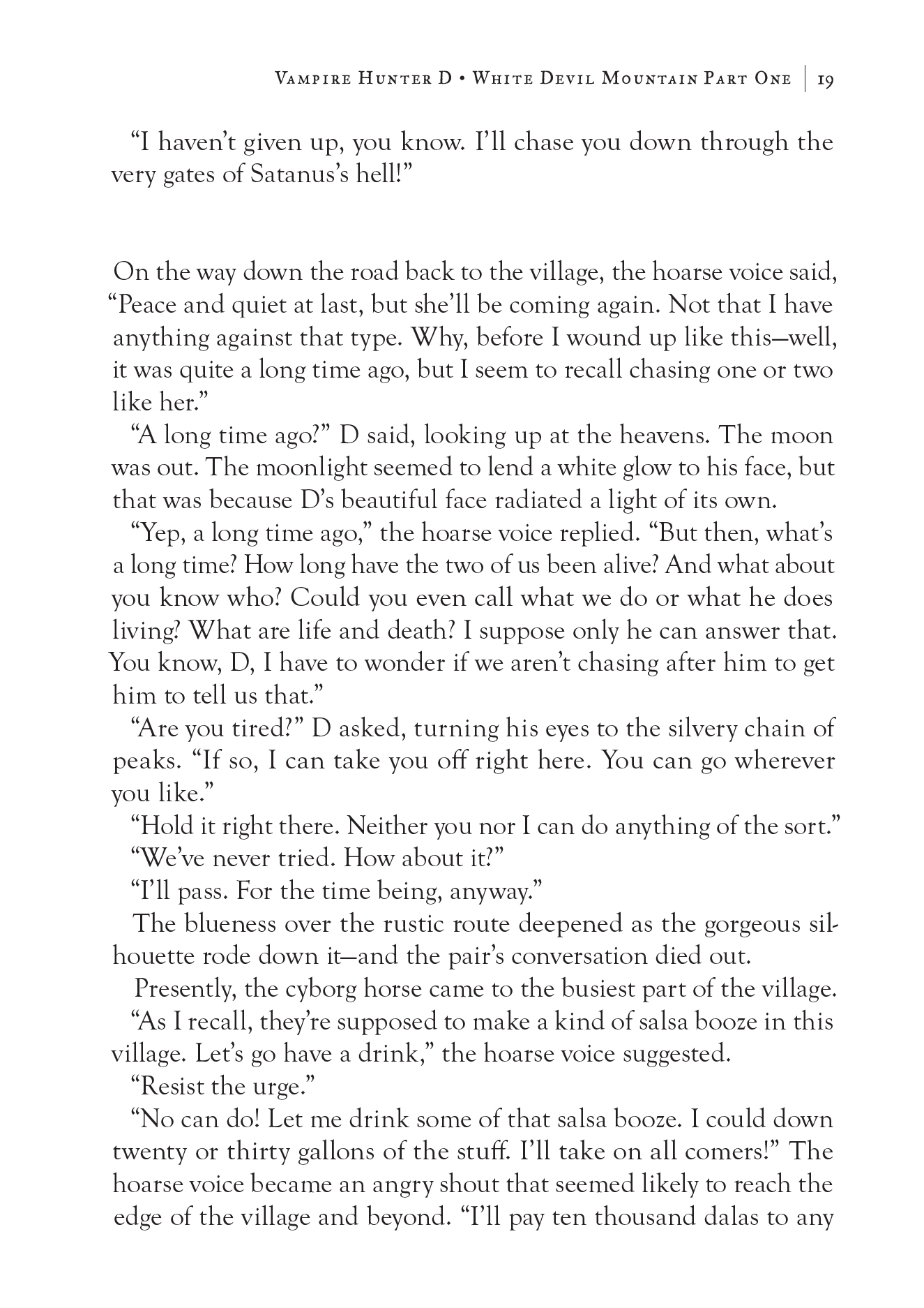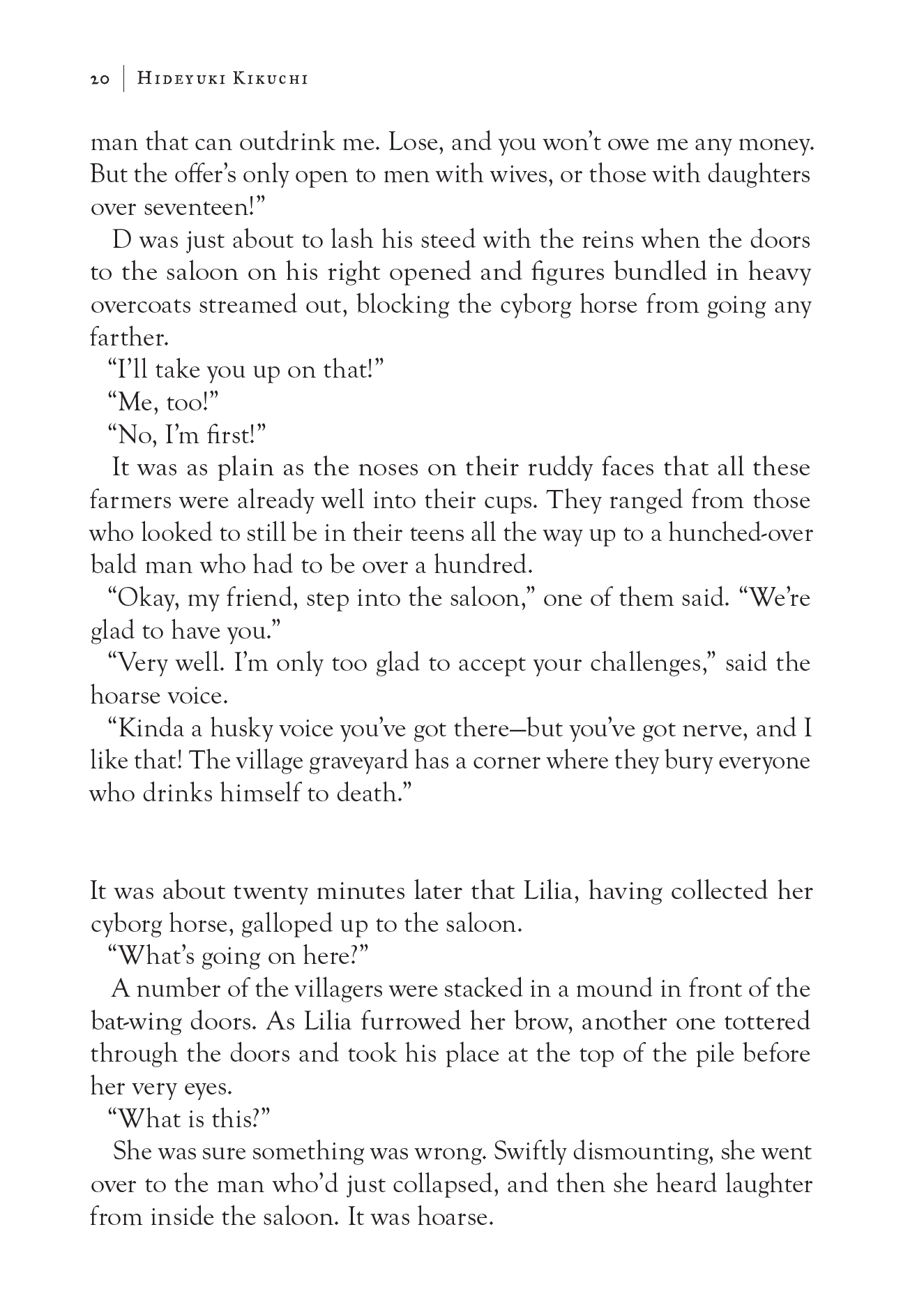The hunt continues in the bizarre far future of 12,090 A.D, where the immortal vampire lords who were the only winners of mankind’s nuclear war still oppress the human survivors who have pushed the blood-drinking fiends back to the lawless Frontier. Yet humanity too remains as quick as ever to prey upon itself, and where the law can’t bring safety or justice, the crescent blade of D will—assuming you meet the half-vampire wanderer’s price!