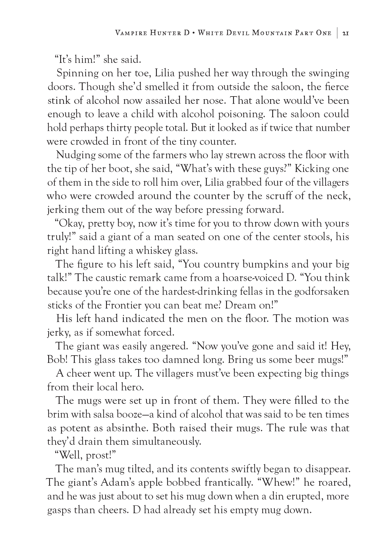 Vampire Hunter D Omnibus Book Eight collects three different complete novels. White Devil Mountain Parts One and Two is the setting of the first: a frightening peak perpetually shrouded in snow—and a desolate gravesite for Duke Gilzen, a vampiric Noble hated even by his own kind, whose coffin D must now retrieve! Iriya the Berserker is the name of a young woman, red-haired and red-cloaked…and red-handed with the hot blood of those facing her daggers, for Iriya is also a Hunter, out to settle accounts for her family, or rather, with the creatures that were once her family! Throng of Heretics uncovers the brutal story of an uprising by humans three centuries past that slaughtered almost an entire vampire clan…but not quite, as five survived in the sanctuary of their crypts. Now 300 years later, the time has come for the undying to seek vengeance on the descendants of the deed—unless D can stop it!