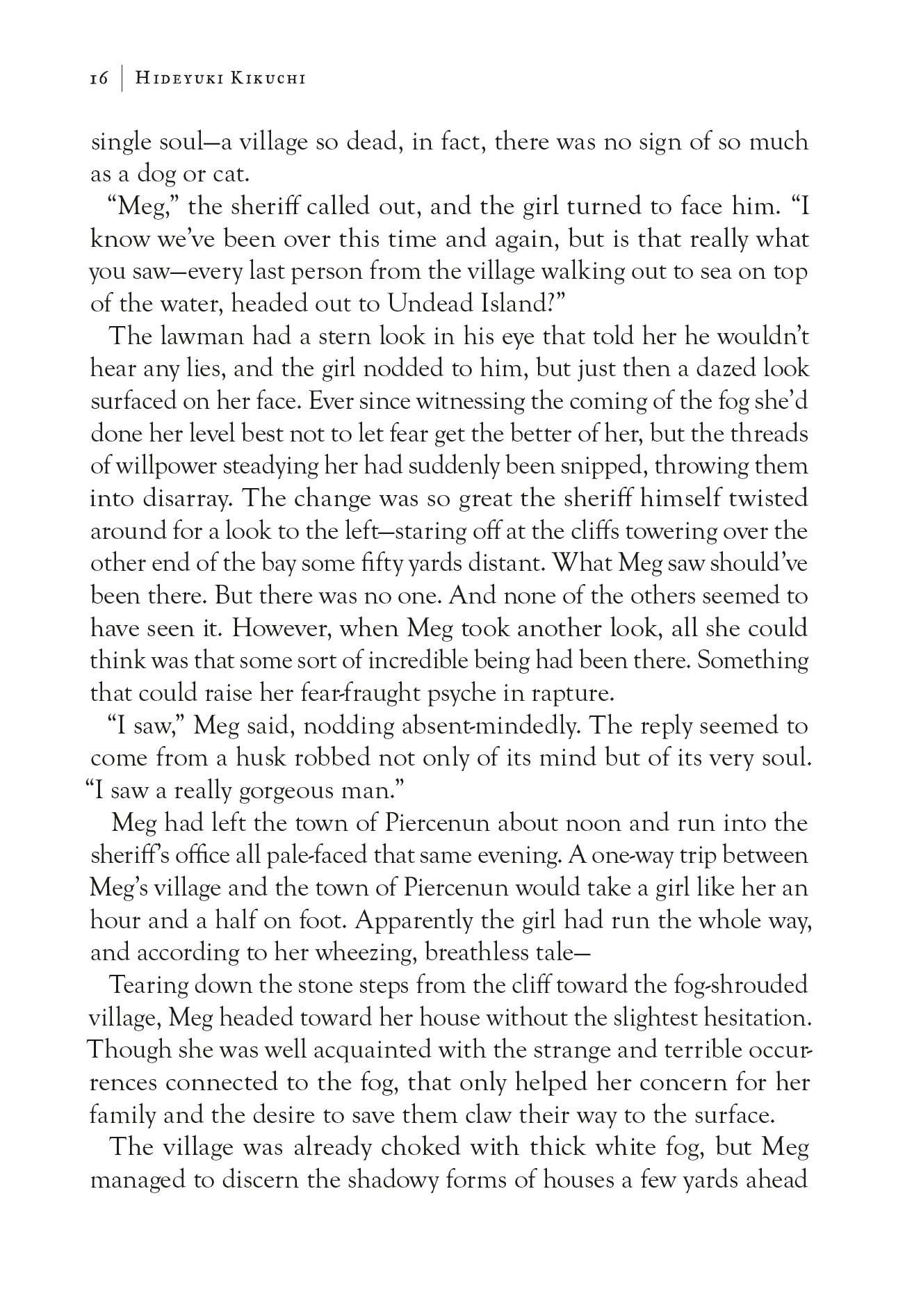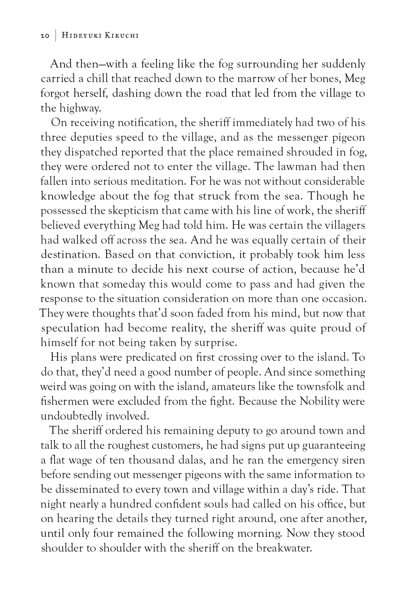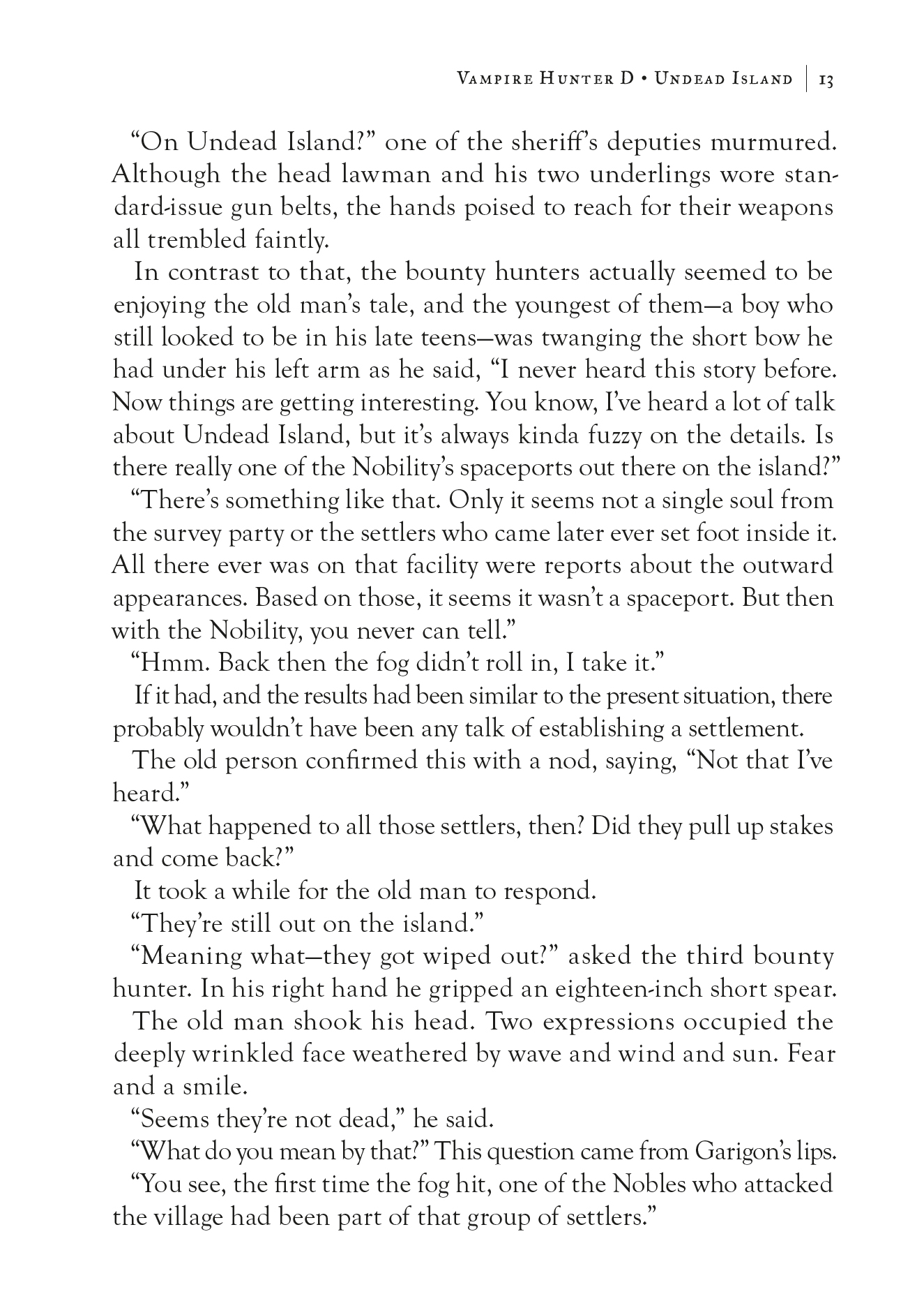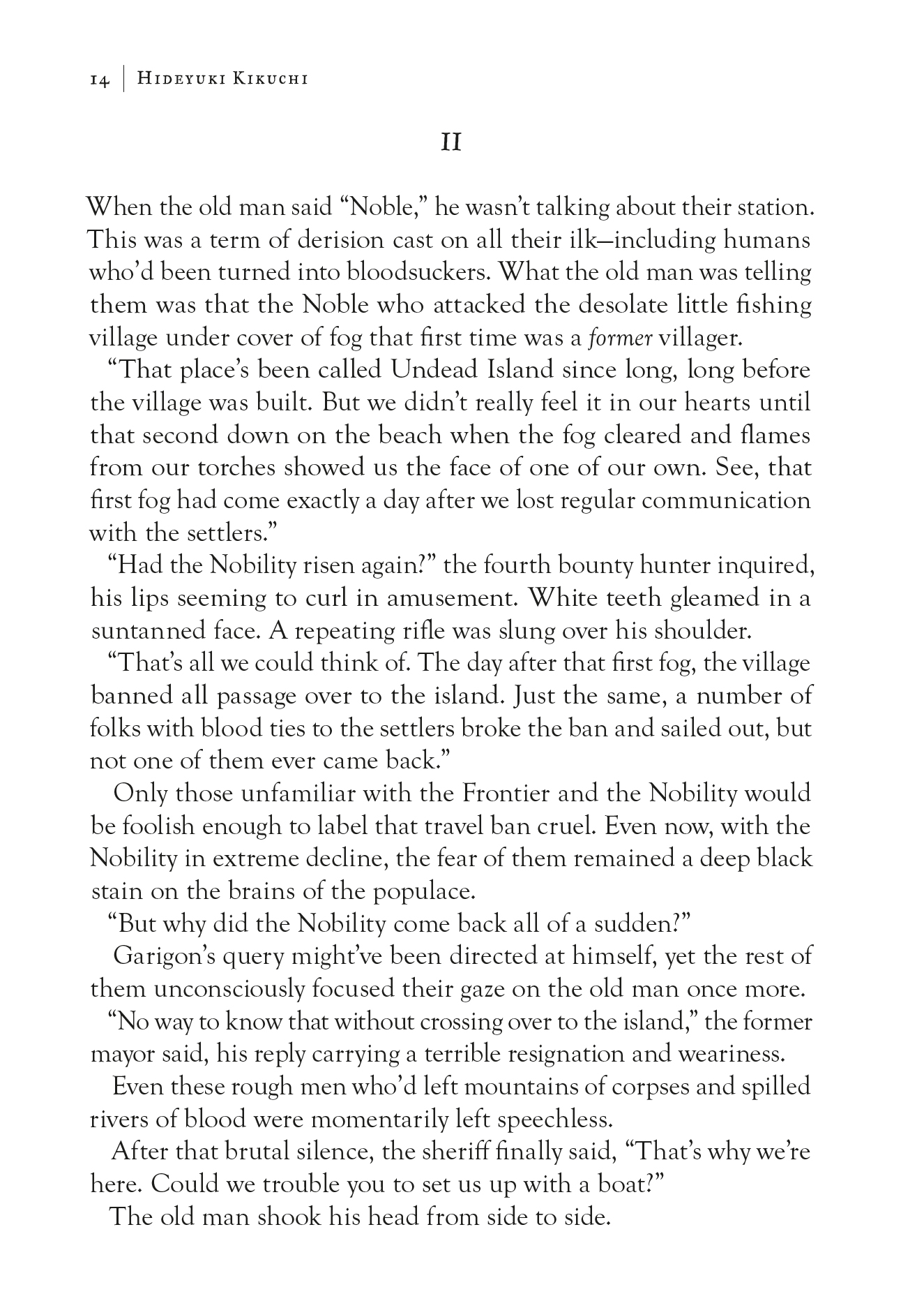 The hunt continues in the bizarre far future of 12,090 A.D, where the immortal vampire lords who were the only winners of mankind’s nuclear war still oppress the human survivors who have pushed the blood-drinking fiends back to the lawless Frontier. Yet humanity too remains as quick as ever to prey upon itself, and where the law can’t bring safety or justice, the crescent blade of D will—assuming you meet the half-vampire wanderer’s price!