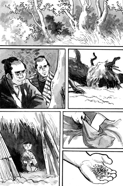 Hooooo doggy! The tension is getting so thick, a dotanuki wielded by the strongest samurai would have a hard time cutting through it! Just two more volumes left until one of the world's most classic pieces of comic-book literature reaches its exciting and emotional conclusion. Two swords remain planted in the ground, awaiting the final duel between the conniving Retsudo and the vengeful Itto, and little Daigoro guards the two blades with his life. Indeed, his life is threatened when a stampede of villagers escaping a burning village almost plow him into the dirt. Impressed townfolk decide to stop and help him, staying for a while on the same beach. For once, Daigoro experiences the joy of being a child, playing with the other children, but that peace won't last long. Yaygu Retsudo, imprisoned in the castle of the shögun, deceives his way to freedom and commands the very last members of the Yagyu ninja to kill Itto! But knowing swords alone won't kill him, Yagyu sends a strange and fascinating weapon to the battlefield, the exploding ninja!