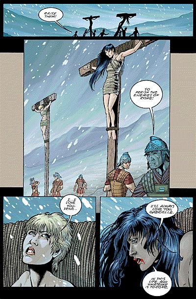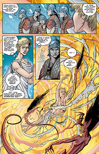 Left for dead on the cross by the Romans, Xena struggles with delirium and deceit as she must decide her fate -- to relive her dark past or to face the grim spectacle of her present. And when her choice casts her into Hell, the big bad guy himself offers her the opportunity to sit at his right hand if she will lure to the Netherworld a pure, powerful soul -- a certain Norse God of Thunder! -- to lead a war against Heaven! These story lines are interwoven with those of the finale of Season 4 and the premier of Season 5 of Xena: Warrior Princess.