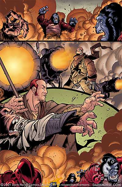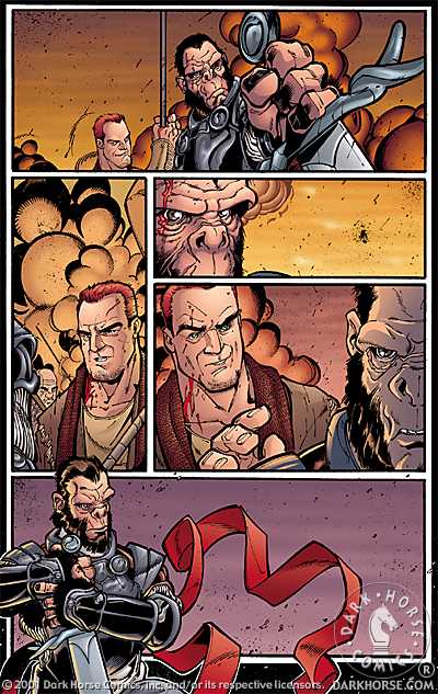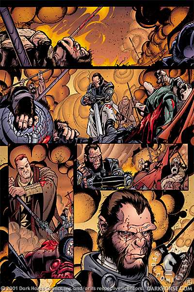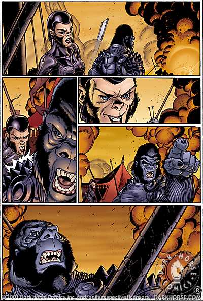 Several decades after human astronaut Leo Davidson's adventure on the ape world, ape society has been torn apart from within by a horrible civil war that's erupted between ape rebels advocating human integration and the fearful but powerful ape regime. Is the ape Seneca and his scattered but loyal followers of humans and apes enough to defeat the charismatic Shiva and her imposing ape army? The conflict has reached a bloody stalemate. But Shiva has a deadly secret that will end the war...and wipe out mankind! After all, the only good human is a dead human! Issue #1 of the series includes an exclusive Topps® Planet of the Apes movie card!