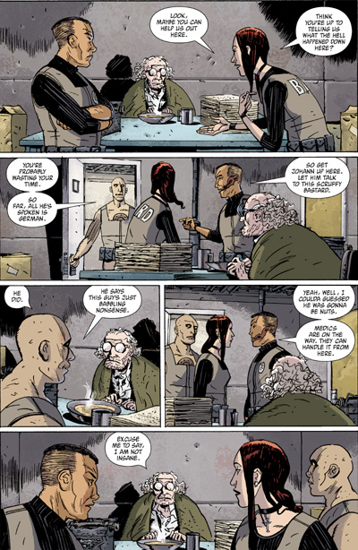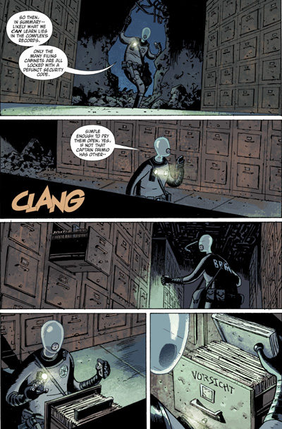 Johann communes with the Bureau's new headquarters, while the eighty-year-old German who'd been living in the basement, surviving on a diet of spiders and mushrooms since the fifties, shares a story of Nazi scientists, occult technology, and the U.S. death-ray cannon. Back east in a small seaside village, Abe Sapien reunites with his dead wife.