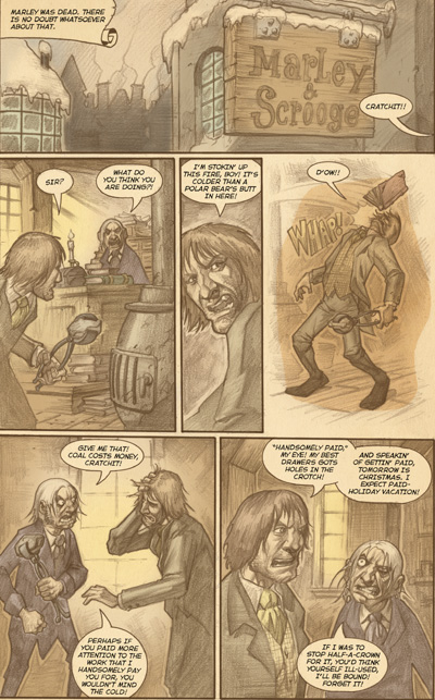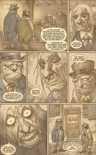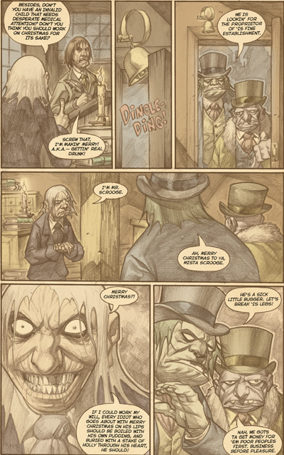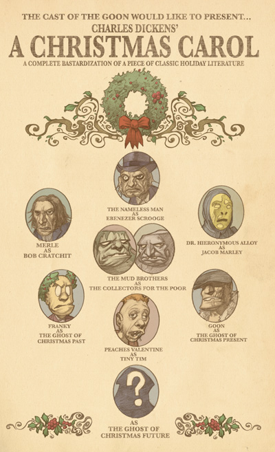 As a special holiday treat the cast of The Goon would like to perform that time-honored holiday classic A Christmas Carole. Yes, it's Dickens' heart-warming tale of a dead-beat dad who always shows up late for work and won't work on Christmas to provide his invalid son with proper medical attention. And then three ghosts come and terrorize some old rich guy into paying for the cripple's medical expenses.