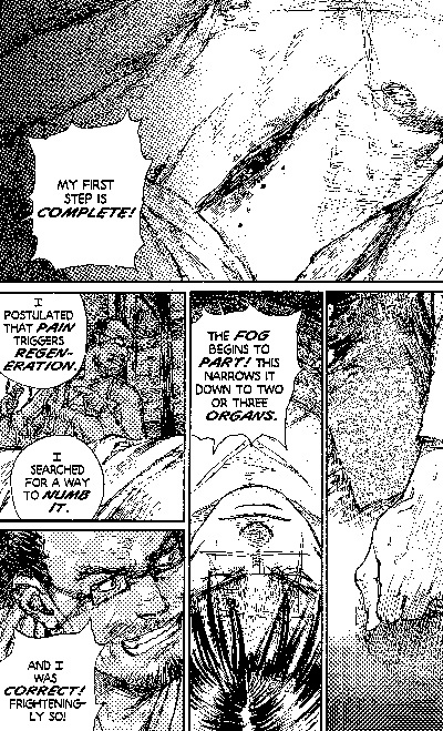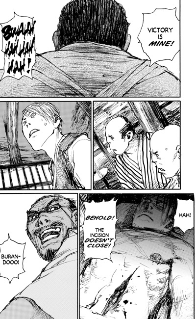Drugged and helpless, Manji's unconscious body is a bloody plaything in the hands of two demented medical examiners! Working for Habaki Kagimura, Burando and Mozen are determined to tap into the secrets of the kessen-chu, the mystical bloodworms that heal Manji's wounds and grant him near-immortality. As Mozen decides to take a direct, heavy-handed approach, the competitive, backstabbing Burando waits gleefully in the wings with katana and scalpel at the ready. Horror, politics, and squabbling surgeons, as Hiroaki Samura takes his award-winning samurai epic down a disturbing, gory pathway.