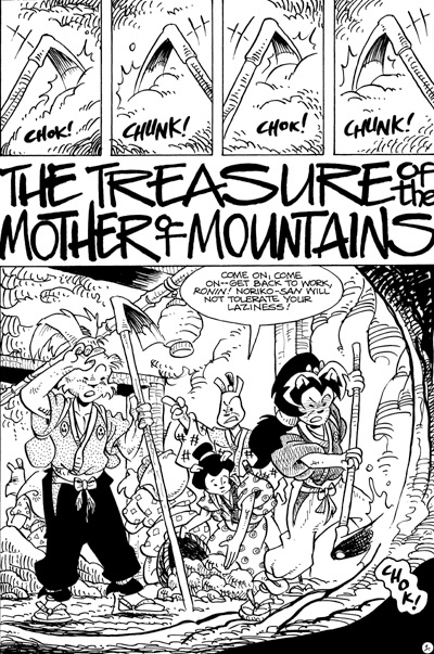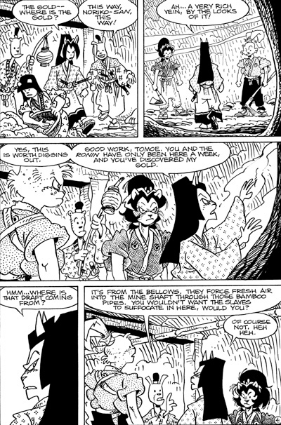 Meanwhile, the young page Motokazu arrives at the "plague-quarantined" village. Even if he discovers Sanada's illicit operation, what can one child do against an army of deadly samurai? Will Geishu Lord Noriyuki act on his misgivings before it is too late?! Find out in part five of "The Treasure of the Mother of Mountains," the latest adventure from world-renowned creator Stan Sakai!
