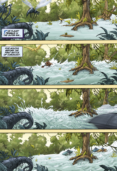 Kenobi's first stop is a frontier town on the swamp world of Trigalis, where he fights a small army of bounty hunters, duels with a crime lord who has ties to Count Dooku, and obtains undercover help from fellow Jedi Aayla Secura. All that just to verify a rumor about an enemy that he can't forget.