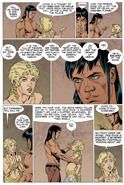 Conan manages to play everyone into the positions he needs them in order to steal the coveted jewels, but he's still victim to the mystical fortress in which they're contained, and the primitive thugs who worship the dead oracle watching over the Teeth of Gwahlur.