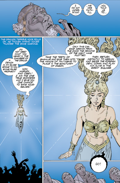 In a story written by Conan creator Robert E. Howard and set later in the character's life, the barbarian must unravel the treacheries of a false goddess and an imposter oracle in a haunted temple where for once it's not Conan doing the decapitations.
