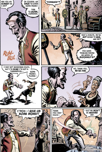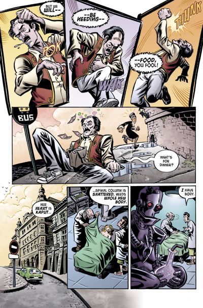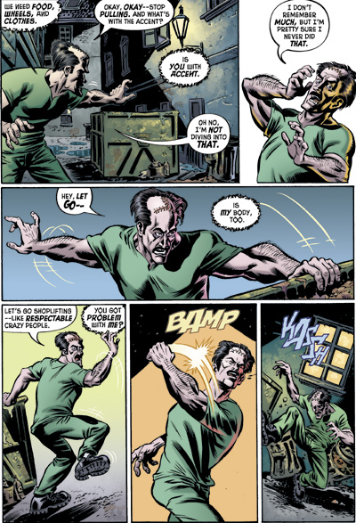 Award-winning artist of The Goon, Eric Powell, pops in for a portrait of Bruce Campbell to wrap around our bloodstained third chapter, in which Campbell's dead wife returns as a robot who's more in love with the cab driver hiding inside her husband's brain than the man himself. Meanwhile in Gyspy Town, the cabbie's ex-wife stages a mannequin wedding--this is comics as only the greatest madman of B-movies could conceive it.