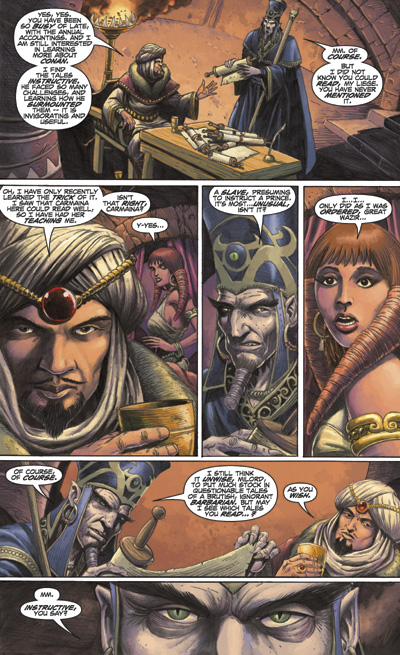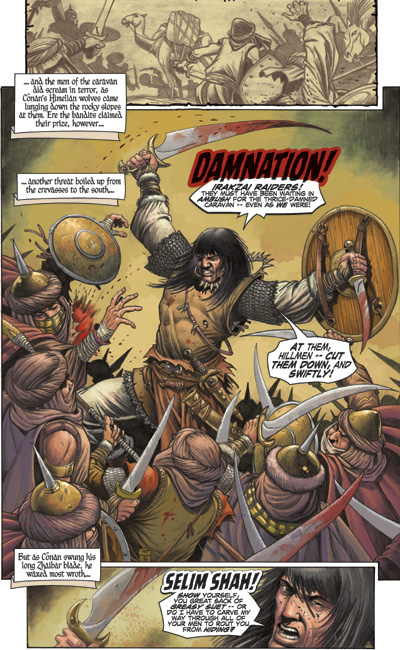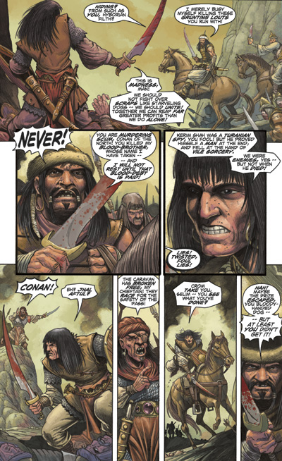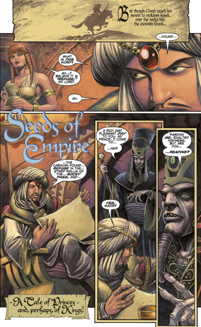 The Prince and his mysterious Wazir, featured in Conan #0 and the series' framing sequences, share center stage with Conan in a two-tiered story. Having added new lands to his father's empire, the Prince must deal with diplomacy, border wars, and a local champion. The Wazir offers guidance with a legend of when Conan was a hill-chief of the Afghulis, high in the Himeliam mountains. Conan is building the seeds of a kingdom-can he betray a brave man to gain power? And if he can, should the Prince do the same?