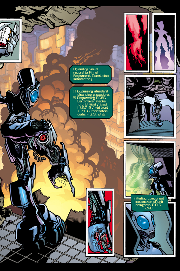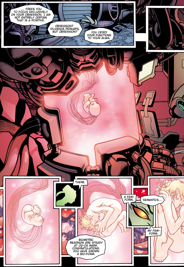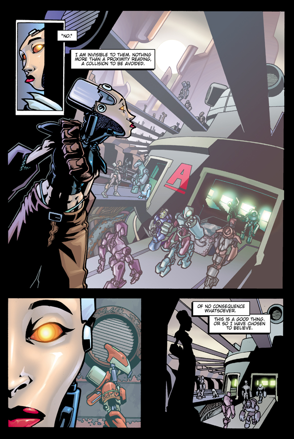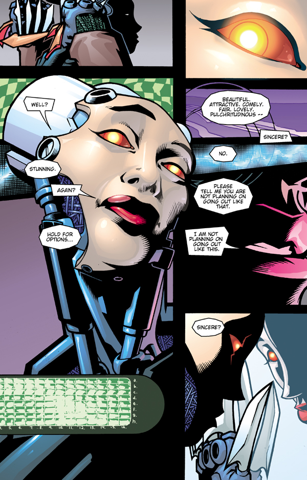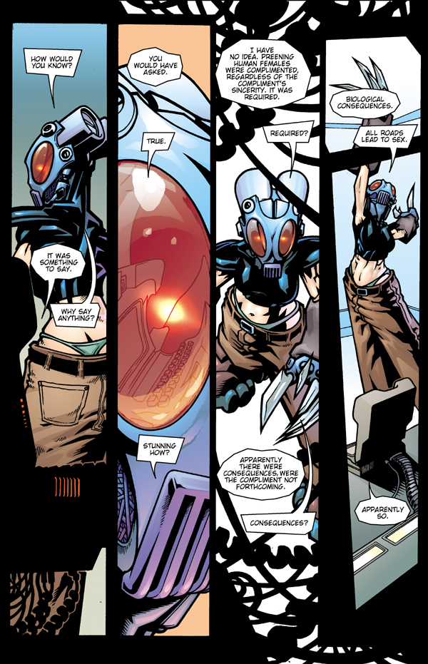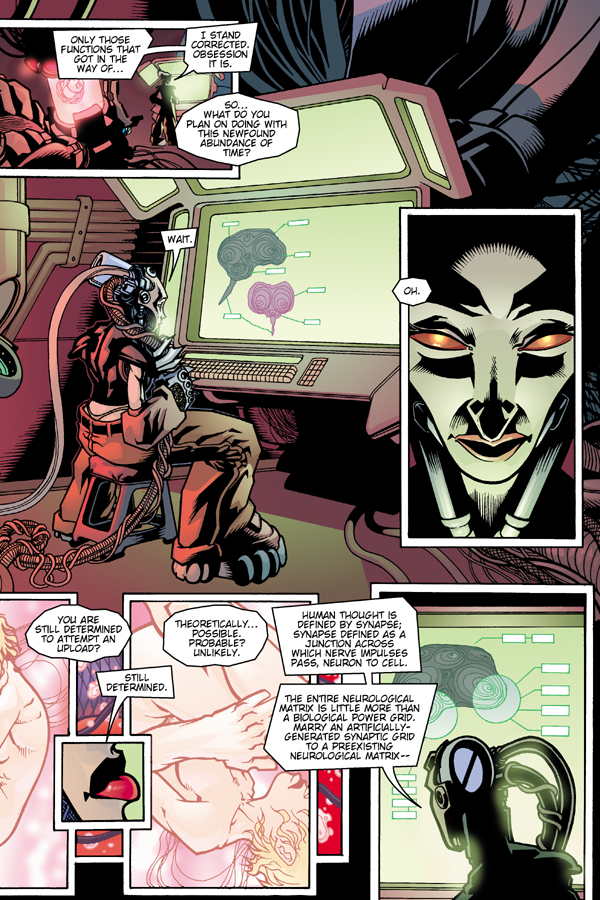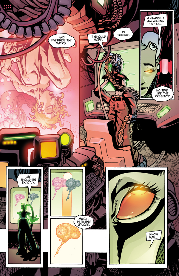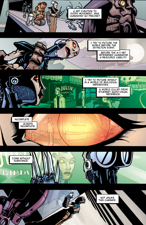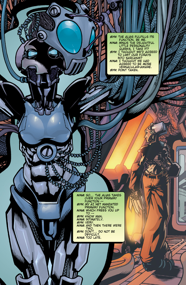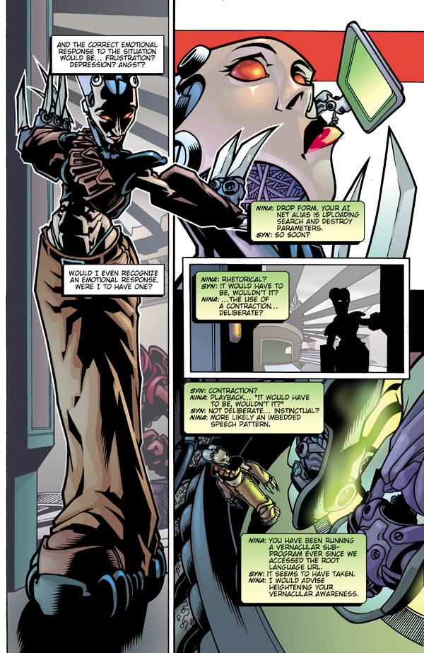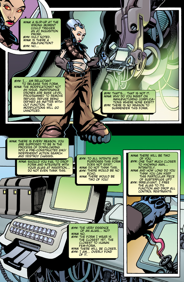 Syn is sent on a mission by the AI Net to hunt down those who have strayed too close to becoming human. Little does she know this mission will be her last and that her own secret longing for humanity will be exposed. The hunter is about to become the hunted! Syn must race to complete her personal quest to "know man" while trying to stay alive. And when she becomes cornered with nowhere to turn, she'll make a decision that will change her life forever! Written by Keith Giffen (Lobo) and illustrated by Greg Titus and Julian Washburn. Don't miss out on one of the most thrilling new comics of 2003!