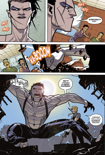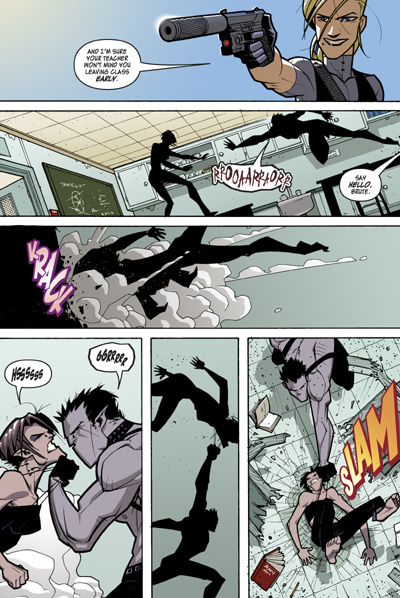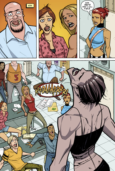 Without skipping a beat, creators Jason Hall and Sean Murphy fling us right back into last issue's classroom cliffhanger. With Agent Bixby's monstrously strong lackey, Brute, ripping apart Liz's high school, our heroine is forced to fight back as her demonic alter-ego, Crush. Walls crumble, rows of lockers are thrown, and Liz will inch towards more answers concerning her demonic predicament and deadly pursuers...if she survives! As Liz's crazy neighbor, Mr. Cooter says, "Witch-girls...government conspiracies...explosions. The whole world is coming to an end!" Well, probably not, but one thing's for sure, Brigston Lassiter High School will never be the same!