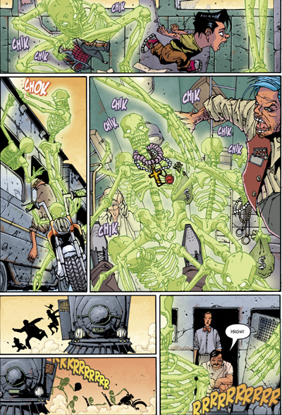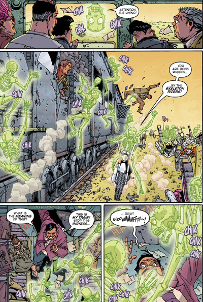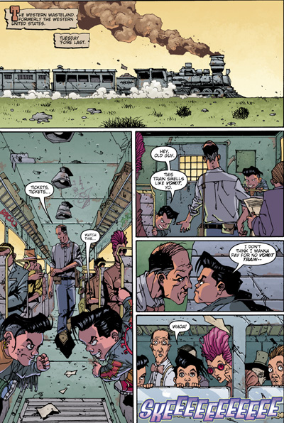 Welcome aboard the Wasteland Express! But let me give you a bit of advice... sit near the back and keep an eye on your wallet. See there's a midget on this train who goes by the name of Fenster; him and his partner Barnum are running a card game that I don't think is on the up-and-up, if you know what I mean. Besides, Barnum just happens to be a cybernetically enhanced gorilla with a laser for an eye. Oh, and Lone's on the train, too, so I think there might be trouble. But if you keep your head down, you should be okay... ALL ABOARD!