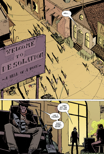 It's been a long road, filled with every danger that the post apocalyptic west could imagine, but now the journey has come to an end. Last stop--Desolation! It's the final confrontation between Lone, the zombie hoard, AND the strange being known only as "The Gunfather" that controls them! Will Lone be able to overcome the zombies and their alien overlord and save Desolation? Or will he merely become another of their victims? This is one issue you don't want to miss!