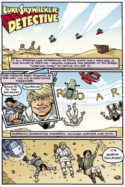 This issue features some of the heavy hitters from the world of indy comics! Gasp as Tony Millionaire (Sock Monkey) offers up a story featuring JAR JAR BINKS’S long suffering father—George R. Binks! Squeal in delight at Peter Bagge (Hate) exposes the underdeveloped leadership skills of Senate Representative JAR JAR BINKS! Gasp as James Kolchaka (American Elf) chronicles the exploits of Boba Fett’s cousin Melvin as he tries to assassinate a JAR JAR BINKS sippy cup! And marvel at the utter lack of JAR JAR BINKS in stories by Gilbert Hernandez (Love & Rockets) and Bob Fingerman (Minimum Wage)! Plus much MORE!