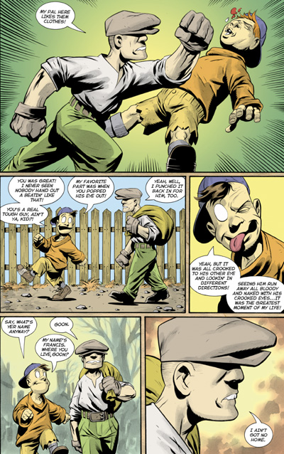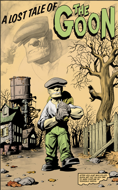 Listen up, mugs! The Goon and Franky have been best friends for as long as we can remember, ever since they was rotten, little tykes. This month you're gonna find out how the two of them became best pals, and how they muscled their way into the rackets of big-time crime-boss, Labrazio -- who, incidentally, nobody's seen in a while. This trip down memory lane ain't gonna be no joyride, neither. There's gonna be zombies, voodoo priests, swearin', ugly people, and a whole bunch of getting cracked on the head wit' a heavy object. You better pick up yer flippin' copy of The Goon before yer dancin' at the end of a rope without any music.