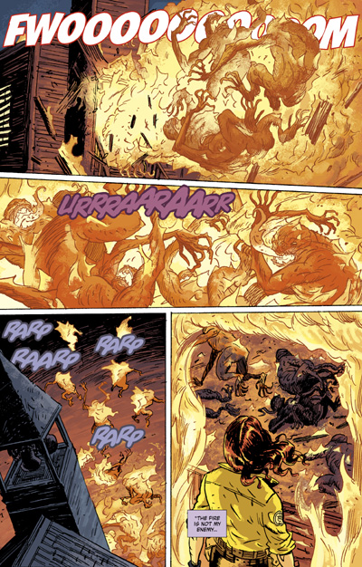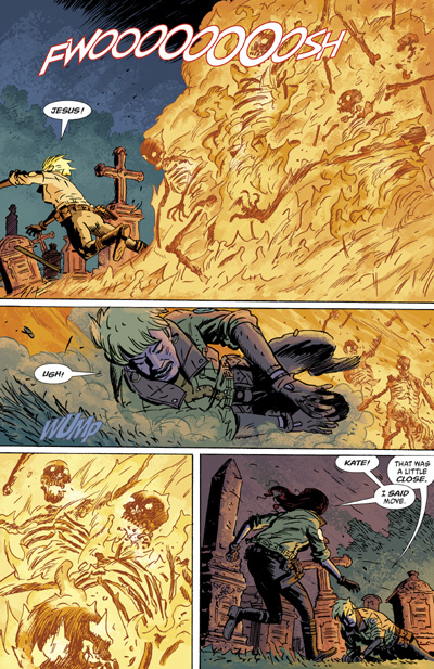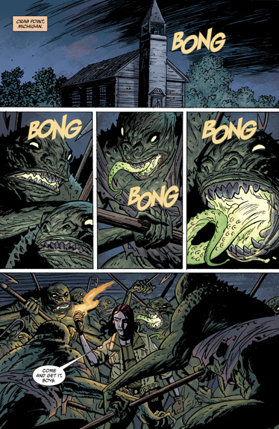 Liz Sherman is set upon by a cemetery full of fungus-driven zombies, and Abe Sapien uncovers the connection between this new generation of monsters and the B.P.R.D.’s old enemy Rasputin. But as the frogmen begin their rituals to raise the old gods, one of the disciples makes good on the threat Rasputin leveled against Abe years ago in Hellboy: Wake the Devil.