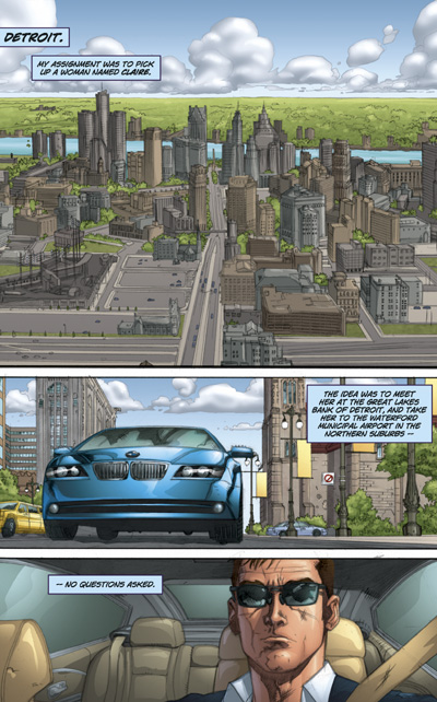 Inspired by the BMW Films series, Dark Horse presents our second story featuring The Hire. Just as each episode in the film series is helmed by a different well-known director, each issue of The Hire is produced by a different top creator or creative team. This issue is written by Bruce Campbell (yeah, that Bruce Campbell) and illustrated by Kilian Plunkett (Superman: Red Son).
