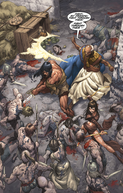 A magical battle explodes, tearing up a forgotten temple as Conan and his assassin cohort take on the most evil man of the ancient world.