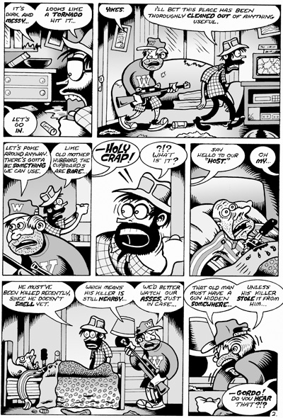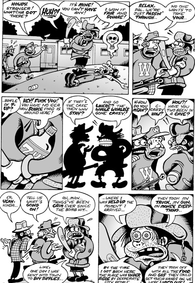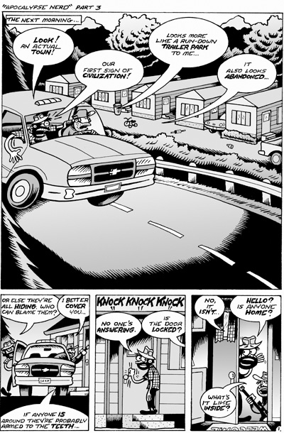 As our heroes Perry and Gordo slowly work their way back towards "civilization," they quickly realize that in the wake of the nuclear attack civilized society no longer exists. Entire communities abandoned! Rednecks killing each other over the last bottle of soda! Communes of nerds living behind barbed-wire encampments-and worst of all, no internet! Can our heroes adapt, or will they head back to the hills?!