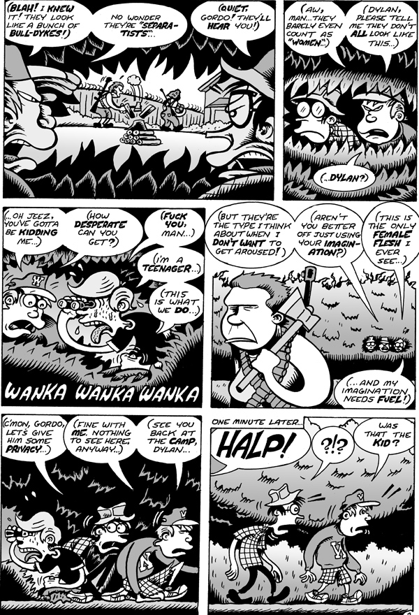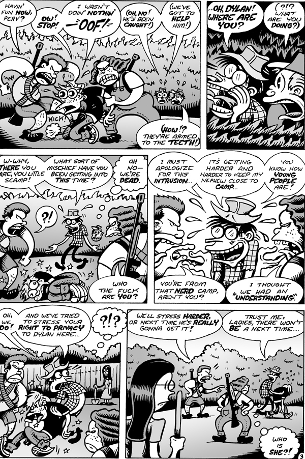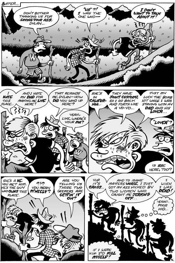 Our "heroes have stumbled across a self-sustaining community of seemingly well-organized scientists and engineers. What luck! The encampment also has food and computers, and the only news that the pair have heard since Seattle went up in a cloud of nuclear smoke. But just when our neurotic, geeky protagonist Perry starts to feel he's sittin' pretty, all hell breaks loose! This could be a permanent rift between him and his best friend, Gordo . . . what's happened now?!