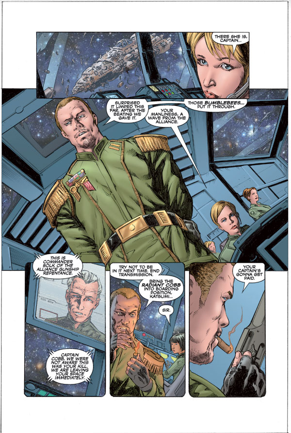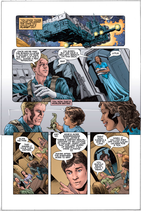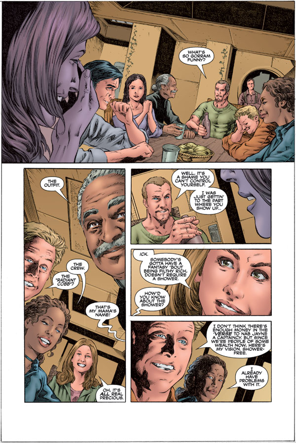 The second issue of Serenity: Better Days, follows Mal and his rag-tag crew on a short-lived vacation, where they explore their fantasies and confront long-forgotten enemies.